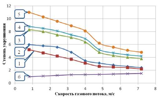 Рис. 9. Зависимости степени укрупнения дисперсных частиц от скорости газового потока: 1 – продольно-колеблющийся излучатель; 2 – дисковый излучатель; 3 – трубчатый излучатель; 4 – трубчатый+дисковый излучатель; 5 – трубчатый+продольно-колеблющийся излучатель; 6 – без УЗ-воздействия