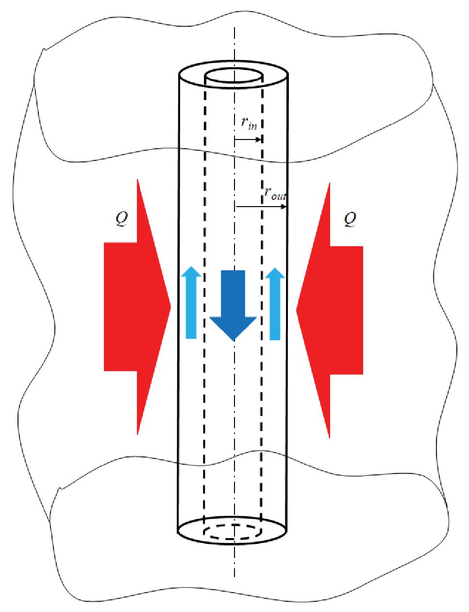 Рис. 2. Схема термостабилизатора с цилиндрической трубой, синяя стрелка показывает направление внутреннего потока жидкого хладагента, голубые стрелки – направления внешнего двухфазного потока хладагента, красные стрелки обозначают тепловой поток на внешней границе внешней трубы