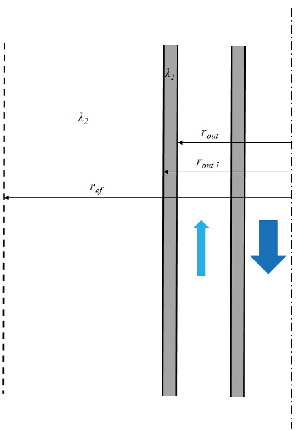 где ρ – плотность материала, проводящего через себя тепловое поле, кг/м3; cp – удельная изобарная теплоёмкость этого материала, Дж/(кг∙К); λ – коэффициент теплопроводности, Вт/(м∙К). На рис. 3 rout1 – внешний радиус внешней трубы, м; λ1 – коэффициент теплопроводности стали, Вт/(м∙К); λ2 – коэффициент теплопроводности грунта, Вт/(м∙К).