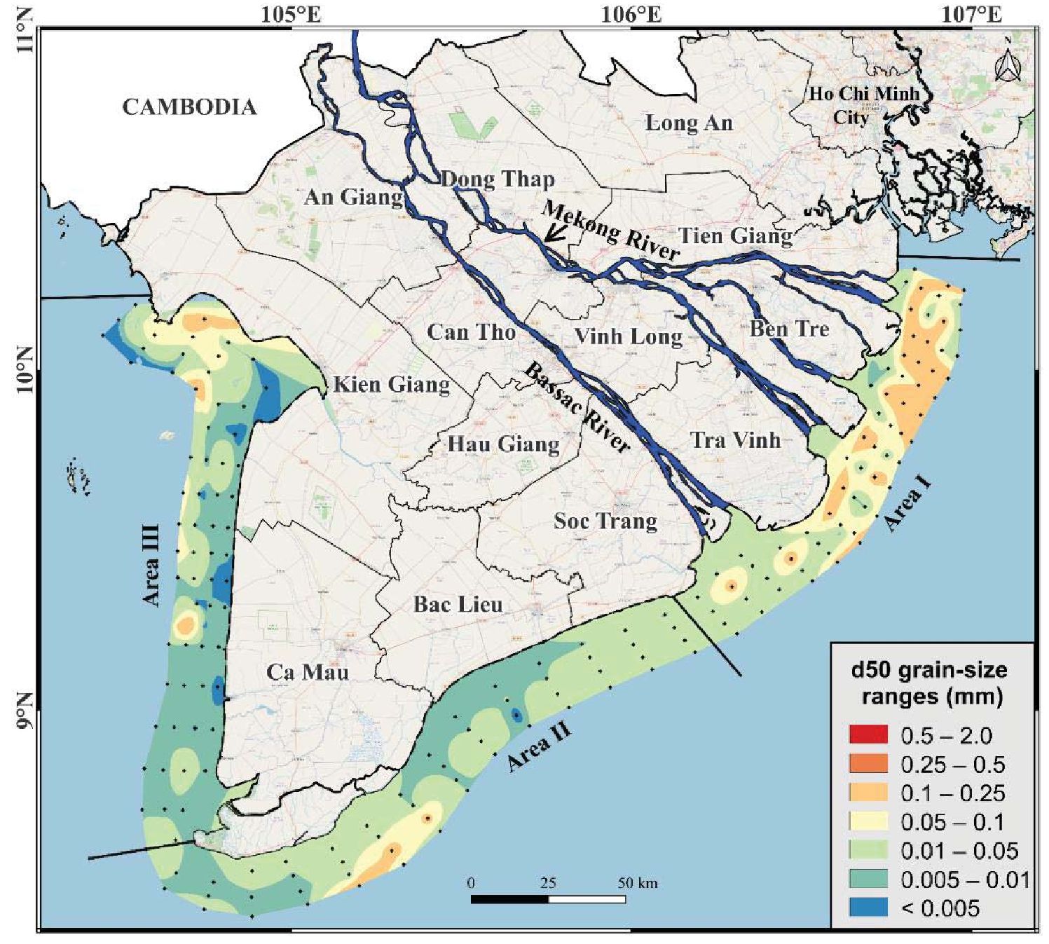 Methods. In order to illustrate changes in sea-bed surface sediment grain size between the two monsoons, we focused on the median grain size, a widely used parameter for sediment transport calculation, and created spatial maps of median grain size along the coastal areas of the Mekong Delta. The analysis was based on sediment samples collected along the coastal areas of the Mekong Delta during field excursions in the southwest and northeast seasons.