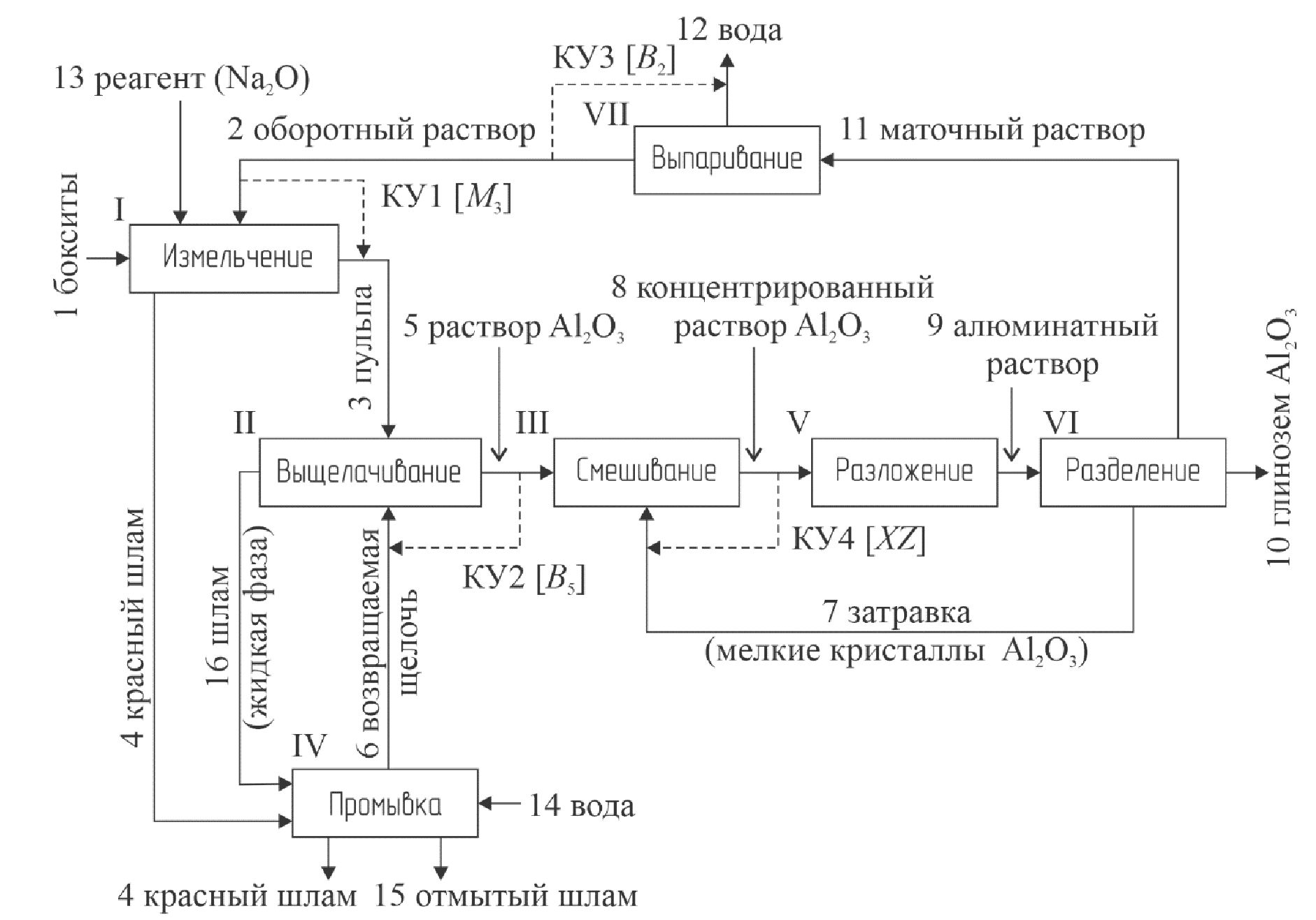 В данном исследовании в качестве объекта рассматриваются технологические комплексы предприятий алюминиевой промышленности на примере гидрохимического производства глинозема мощностью 200 МВт в Павлодарской области Республики Казахстан. Для данных производств характерны: нелинейность, многосвязность, превышение объемов циркулирующих материальных потоков над объемами прямых материальных потоков, отсутствие для отдельных технологических переделов пропорциональной зависимости между входом и выходом, неопределенность параметров, связанная с различающимся химическим составом сырья.