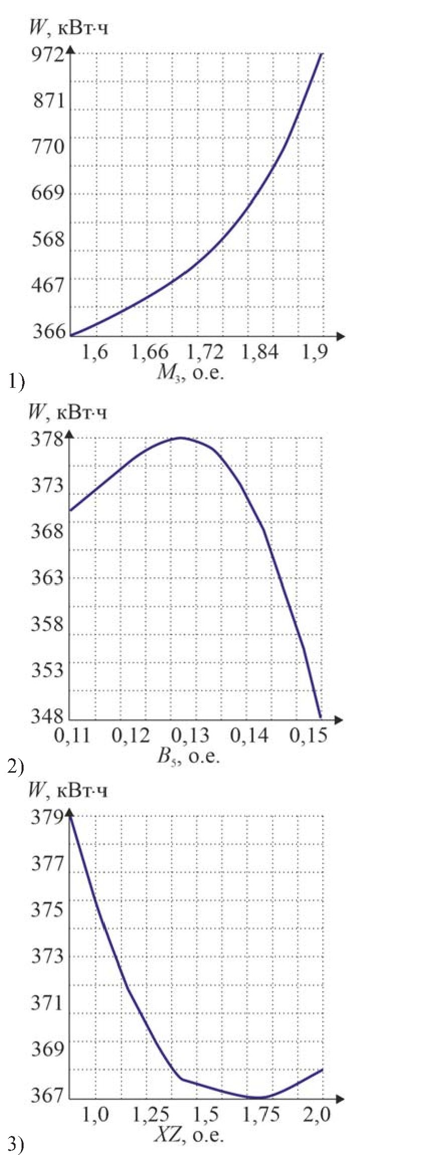 Анализируя результаты моделирования, можно сделать вывод, что реакция изменения энергопотребления W на изменение входных параметров М3 и В5 в целом соответствует статической характеристике, показанной на рис. 3.