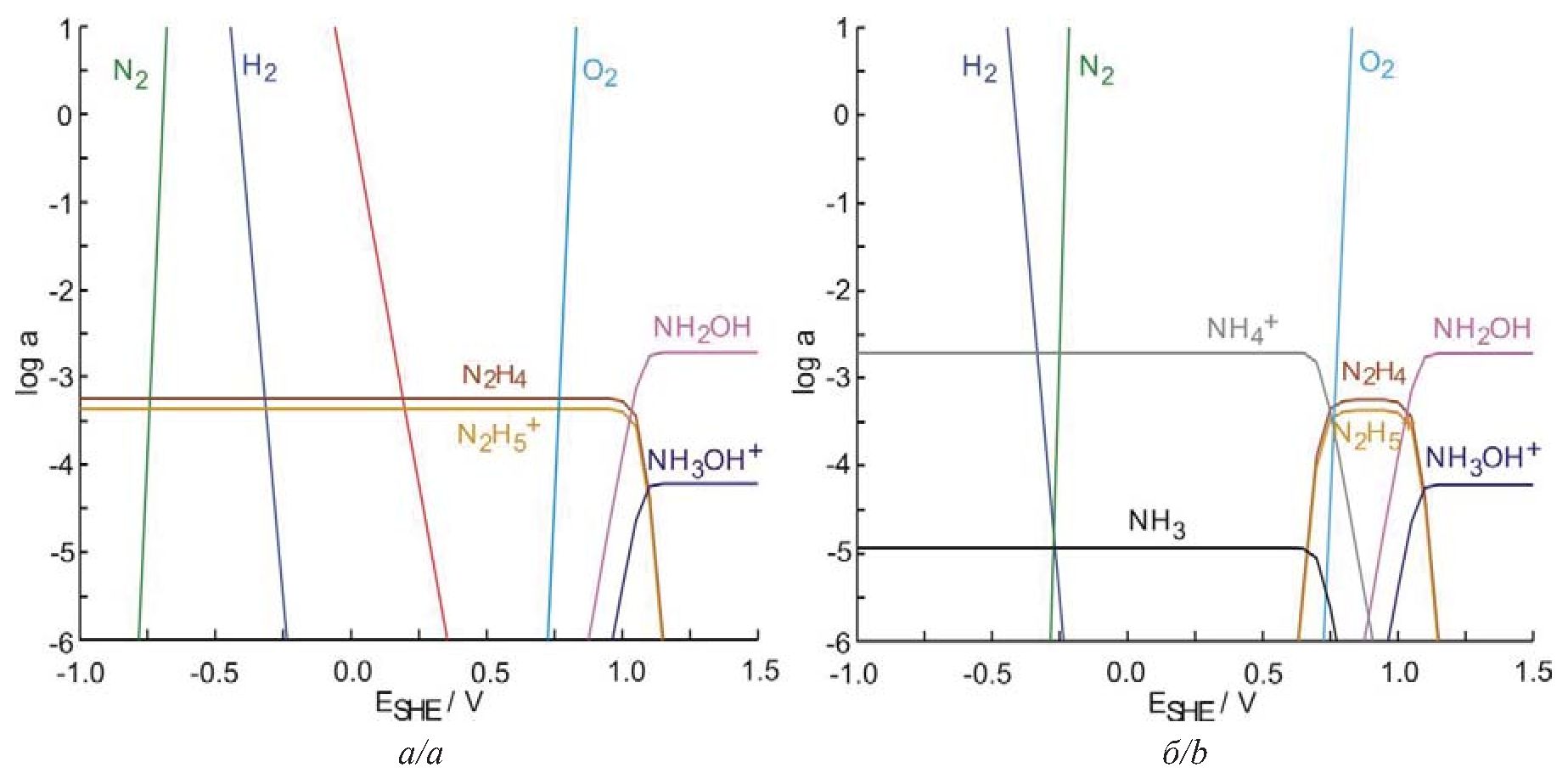 Рис. 2. Расчетные диаграммы «логарифм активности – потенциал» для окислительно-восстановительных равновесий в системе N2–H2O, учитывающие совместное присутствие (а) трёх и (б) четырёх ионно-молекулярных форм с различными степенями окисления азота ([N2H4]=0,001 M, t=25 °С, рН=3)