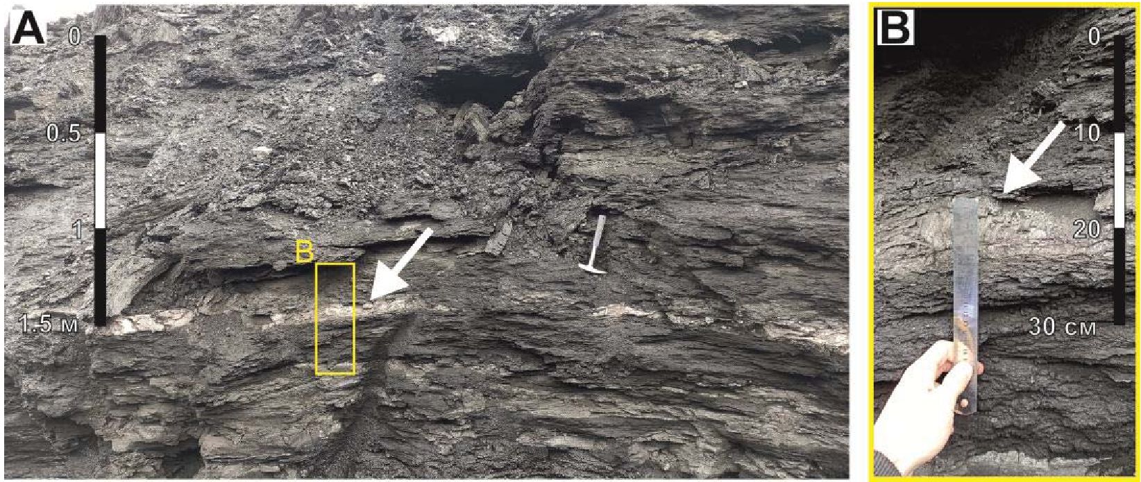 Рис. 2. Тонштейн в угольном пласте Новый-1а: A) положение тонштейна в угольном пласте; B) детальный вид тонштейна