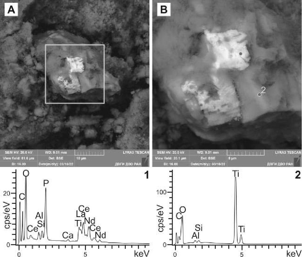 Также в тонштейне обнаружена минеральная Nb-содержащая фаза, по составу близкая к группе пирохлора (рис. 4, B). Диагностируются фосфаты легких и тяжелых РЗЭ. Легкие РЗЭ представлены монацитом, преимущественно монацитом-(Ce). В ряде фаз наблюдается примесь тория. Тяжелые РЗЭ представлены ксенотимом-(Y). Ксенотим встречается как в виде отдельных фаз, так и в виде микровключений на поверхности цирконов. На зерне, состоящем из TiO2 (рис. 5, A), сформировался агрегат, состоящий из монацита-(Ce) (рис. 5, B).