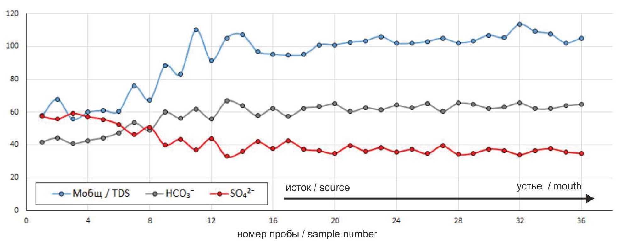 В ионном составе преобладание сульфат-иона наблюдается в «горной» части, где на поверхности и близко к ней залегают гипссодержащие горные породы. Ниже по течению соотношение двух главных анионов изменяется и составляет 65 %-экв. для HCO3– и 35 %-экв для SO42– (рис. 4), при этом отмечается закономерный рост минерализации.