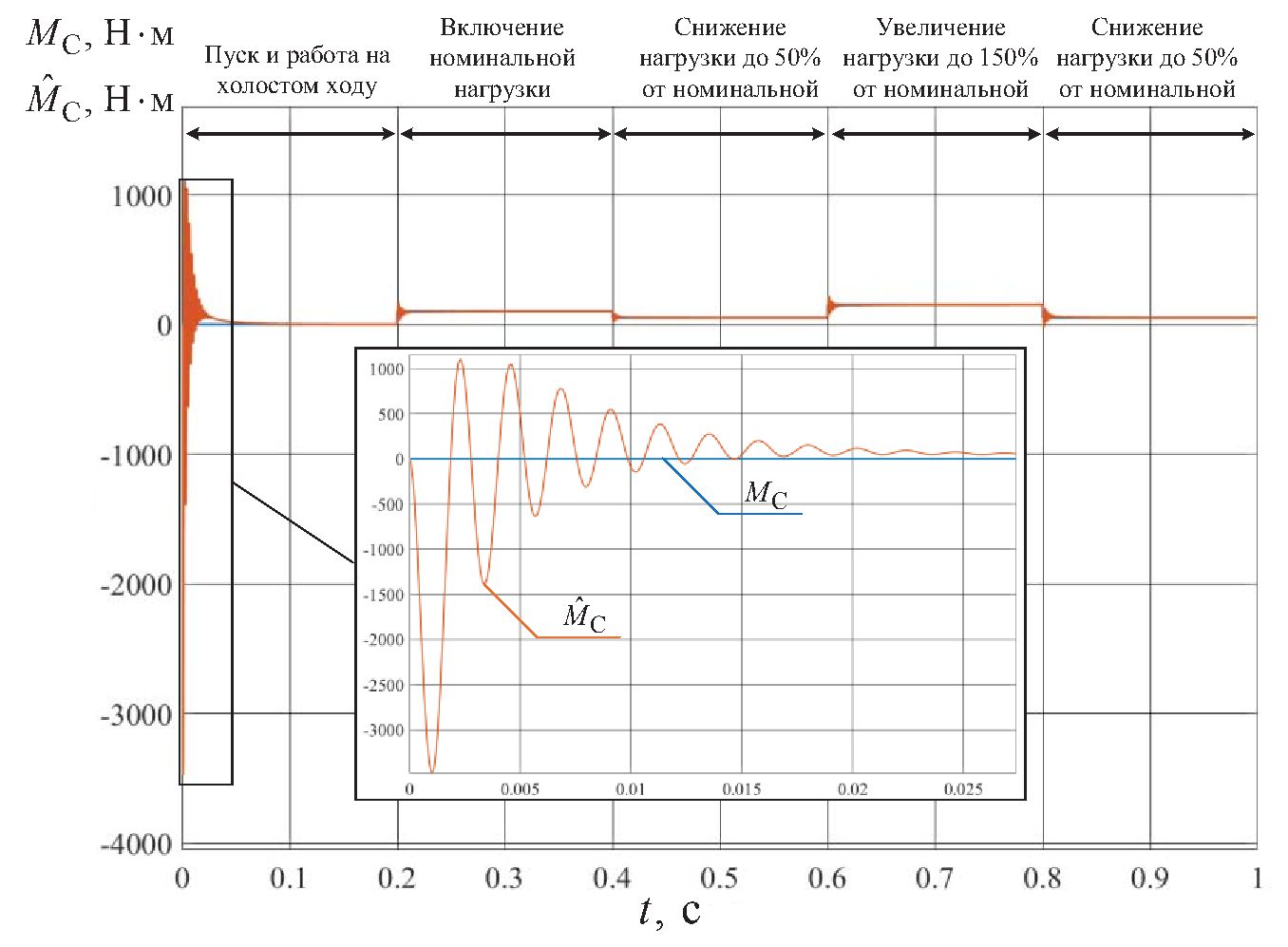 Выполним оценку работоспособности наблюдателя при изменяющейся нагрузке на валу. В качестве условия работоспособности наблюдателя примем, что величина погрешности оценок угловой скорости и момента сопротивления не должна превышать 5 %, что является общепринятым в инженерной практике. Переходные характеристики оценок угловой скорости ротора и ее абсолютной погрешности при различных значениях момента нагрузки приведены на рис. 2, графики переходных процессов момента сопротивления на валу и ее оценки наблюдателем – на рис. 3.