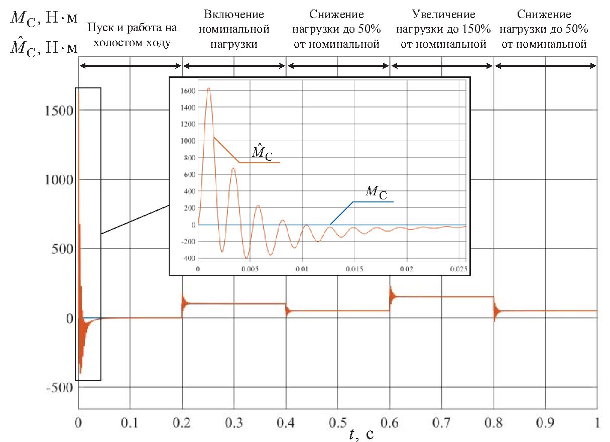 Как следует из анализа рис. 2, 3 и табл. 2, на всех участках изменения нагрузки относительная погрешность оценивания угловой скорости ротора и момента сопротивления на валу составляет не более 0,05 %.