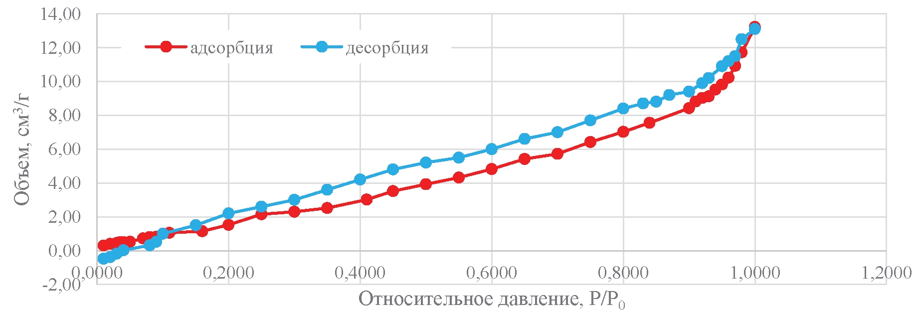 Рис. 5. Изотерма адсорбции–десорбции азота при 77 К (гидроуголь (250 °С, 2 ч))