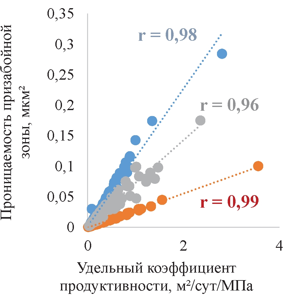 Данные уравнения применимы для оперативного определения проницаемости ПЗП в условиях карбонатного объекта исследуемого месторождения Пермского края. Предлагаемый подход может быть тиражирован на другие объекты со статистически значимым количеством гидродинамических исследований.