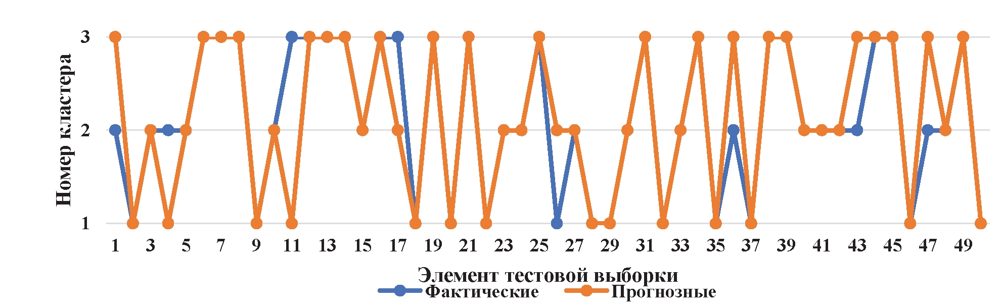 На рис. 3 представлен график сравнения фактических и прогнозных значений классификации исходных данных на кластеры. На вертикальной оси отмечены значения номера кластера (1, 2, 3). На горизонтальной оси 50 элементов тестовой выборки, по которой выполняется сравнение сходимости модели, точность составила 84 % (рис. 3). В качестве дополнительной метрики качества модели добавлен показатель F1-score, который объединяет в себе два важных показателя: Precision (Точность), Recall (Полнота) и является более обоснованным в случае, когда классы не сбалансированы. F1-score составил 83,3 %.