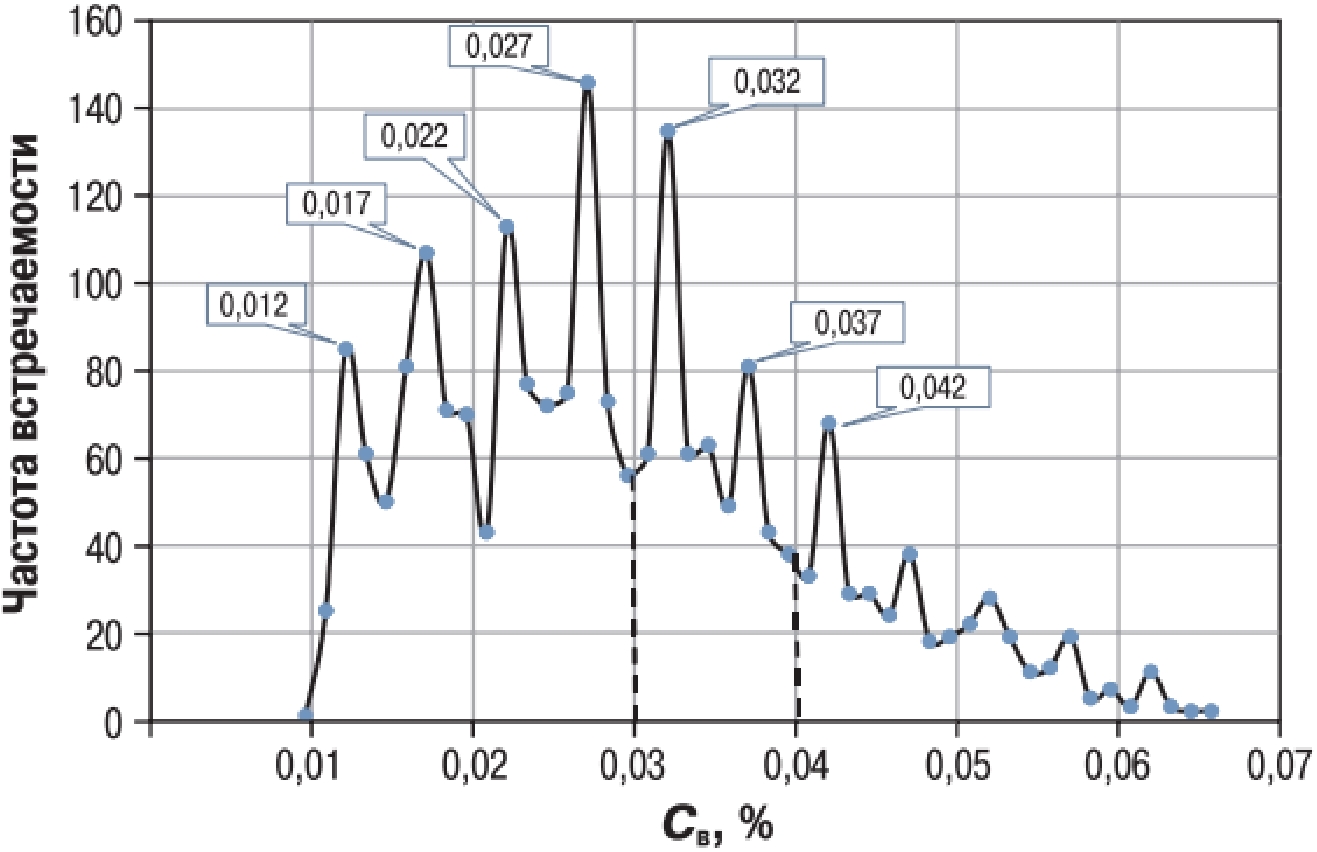 С использованием метода определения геохимических элементов по материалам ГМИС было рассчитано относительное содержание бора на исследуемой территории. Гистограмма мультимодального статистического распределения относительного содержания бора, нормированного на коэффициент глинистости, имеет полимодальную форму (рис. 2) [23].