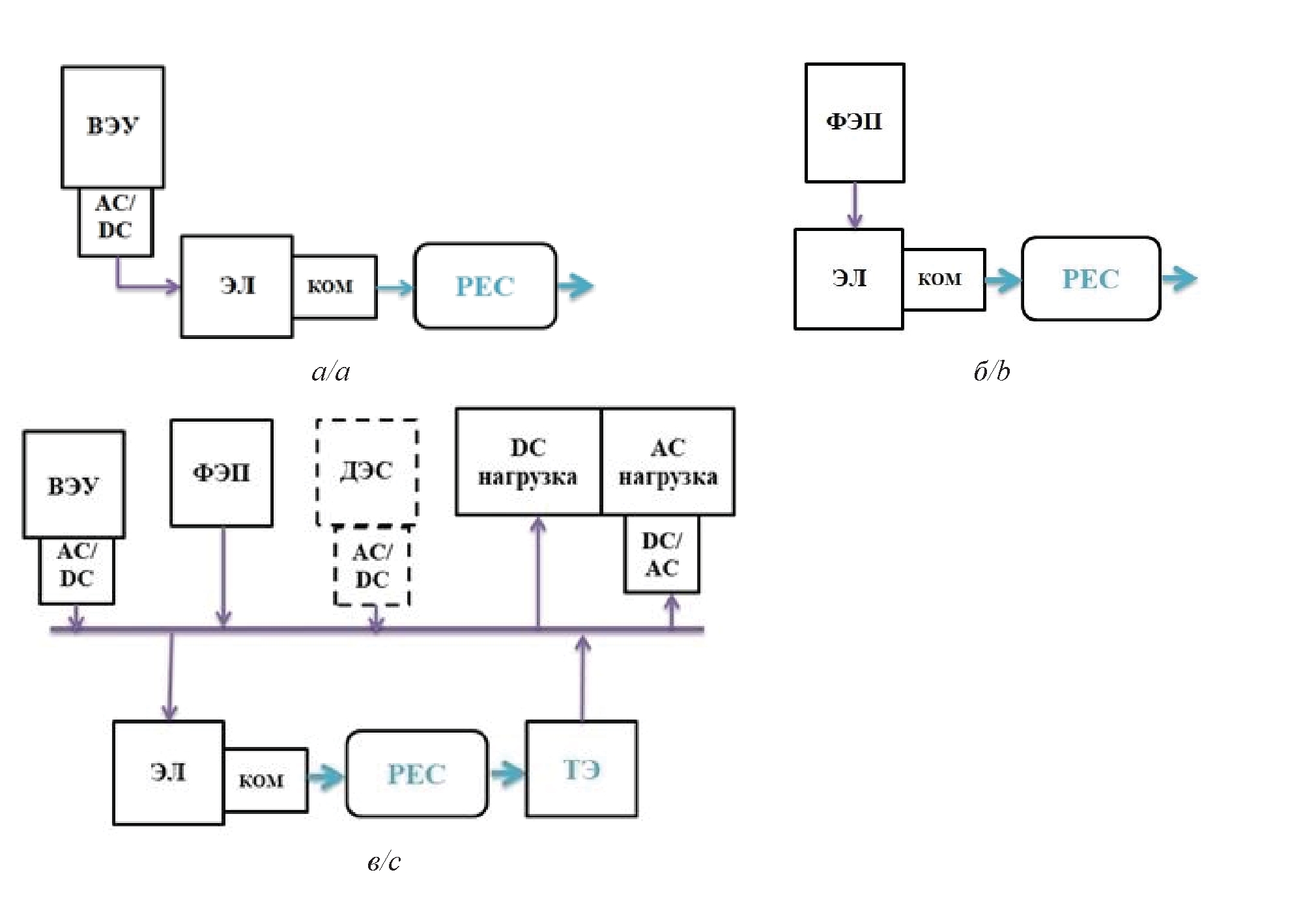 Рассмотрены три варианта производства и использования водорода: 1) источник электроэнергии – ВЭУ (рис. 2, a) источник электроэнергии – ФЭП (рис. 2, б), 3) водород производится в автономной энергосистеме с ВЭУ и ФЭП за счёт «избыточной» электроэнергии, когда мощность возобновляемых источников энергии превышает мощность нагрузки (рис. 2, в). На рис. 2, а–в используются следующие обозначения: AC/DC – преобразователь переменного тока в постоянный, ЭЛ – электролизёр, КOM – компрессор, РЕС – ресивер (ёмкость для хранения водорода), ТЭ – топливный элемент, ДЭС – дизельная электростанция, DC/AC – преобразователь постоянного тока в переменный.
