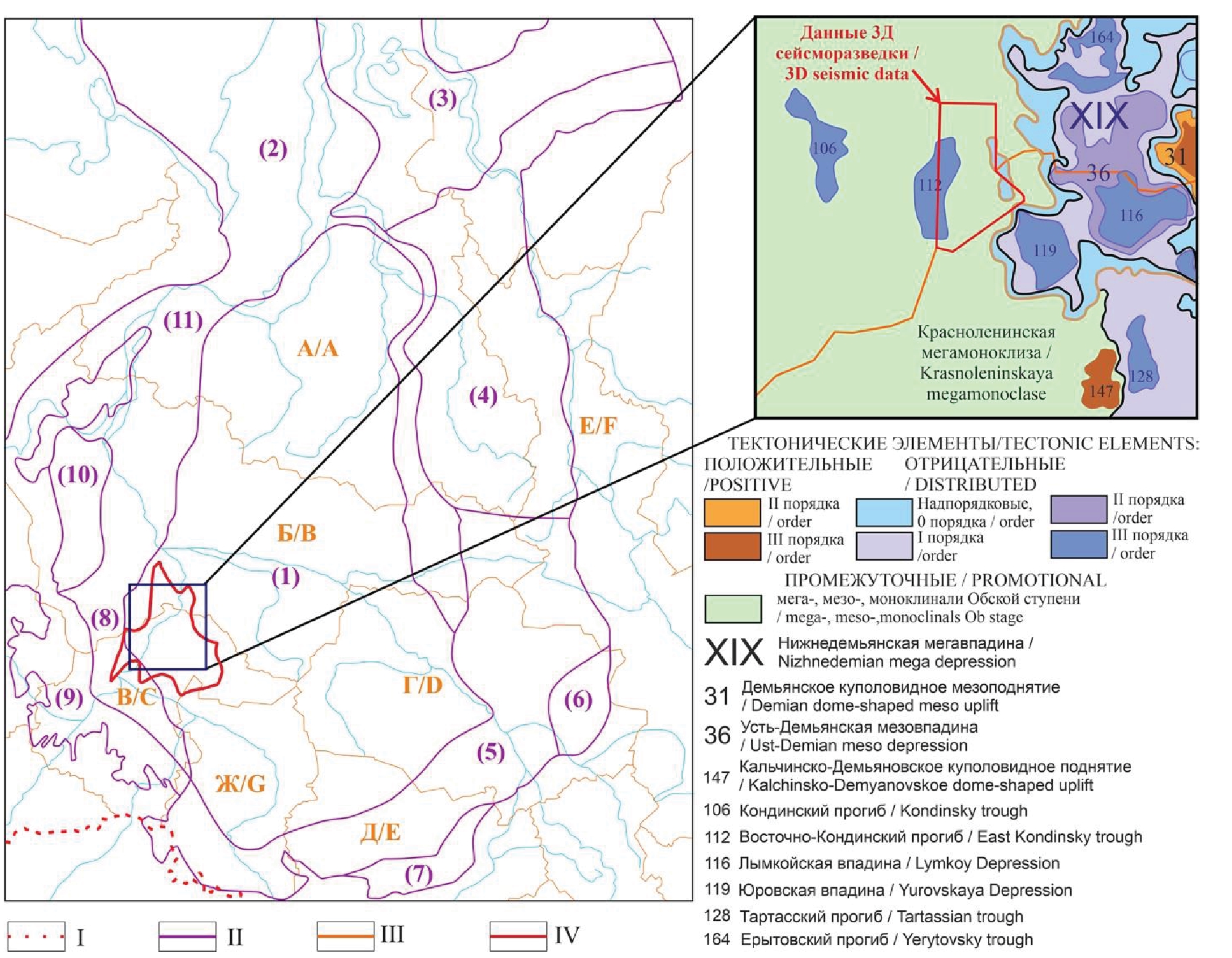 В тектоническом плане большая часть района исследований приурочена к мезомоноклинали Обской ступени, в строении которой выделяются отрицательные структуры III порядка. Восточная часть Уватского НГР располагается на территории распространения Нижнедемьянской мегавпадины (рис. 1), осложнённой группой более мелких отрицательных структур.