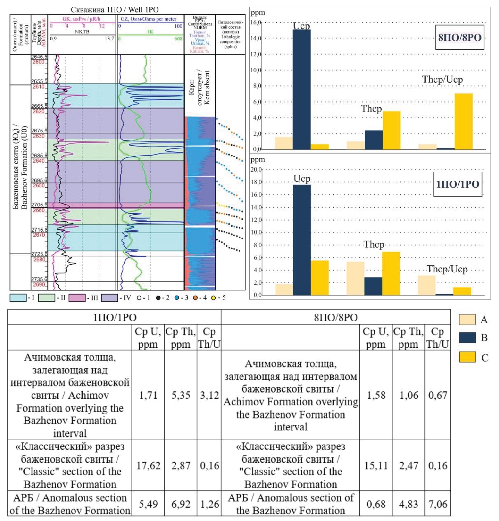 По результатам выявления вклада радиоактивных элементов в общую естественную радиоактивность отмечаются существенные отличия этих параметров для ачимовских пород и терригенной составляющей баженовской свиты. В двух проанализированных скважинах отмечается расхождения в значениях U и Th. Вклад в среднюю радиоактивность U в интервале распространения терригенных пород АРБ в скважине 1ПО составляет 5,49 ppm, а в 8ПО – 0,68 ppm. При этом значения в интервале классического разреза баженовской свиты (1ПО – 17,62 ppm; 8ПО – 15,11 ppm) и ачимовской толщи (1ПО – 1,71 ppm; 8ПО – 1,58 ppm) сопоставимы. Обратная ситуация наблюдается по результатам определения средних значений вклада Th в естественную радиоактивность. В интервалах АРБ (1ПО – 6,92 ppm; 8ПО – 4,83 ppm) и классического разреза баженовской свиты (1ПО – 2,87 ppm; 8ПО – 2,47 ppm) значения сходны, а в интервале ачимовской толщи (1ПО – 5,35 ppm; 8ПО – 1,06 ppm) различны. Описанное позволяет предположить, что ачимовские отложения и терригенные породы АРБ в скважинах 1ПО и 8ПО разновозрастны и различны по составу.