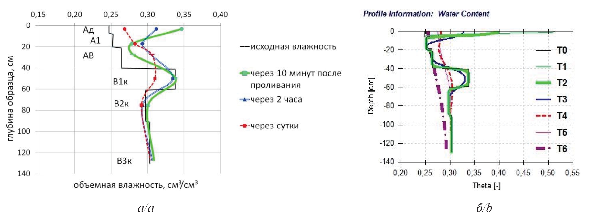 Fig. 6. Profile moisture distribution in leached chernozem of the apple orchard at the Gorno-Altaiskoe experimental station after irrigation (equivalent to 20 mm of precipitation): measured contents (а) and values modeled in Hydrus-1D (b)