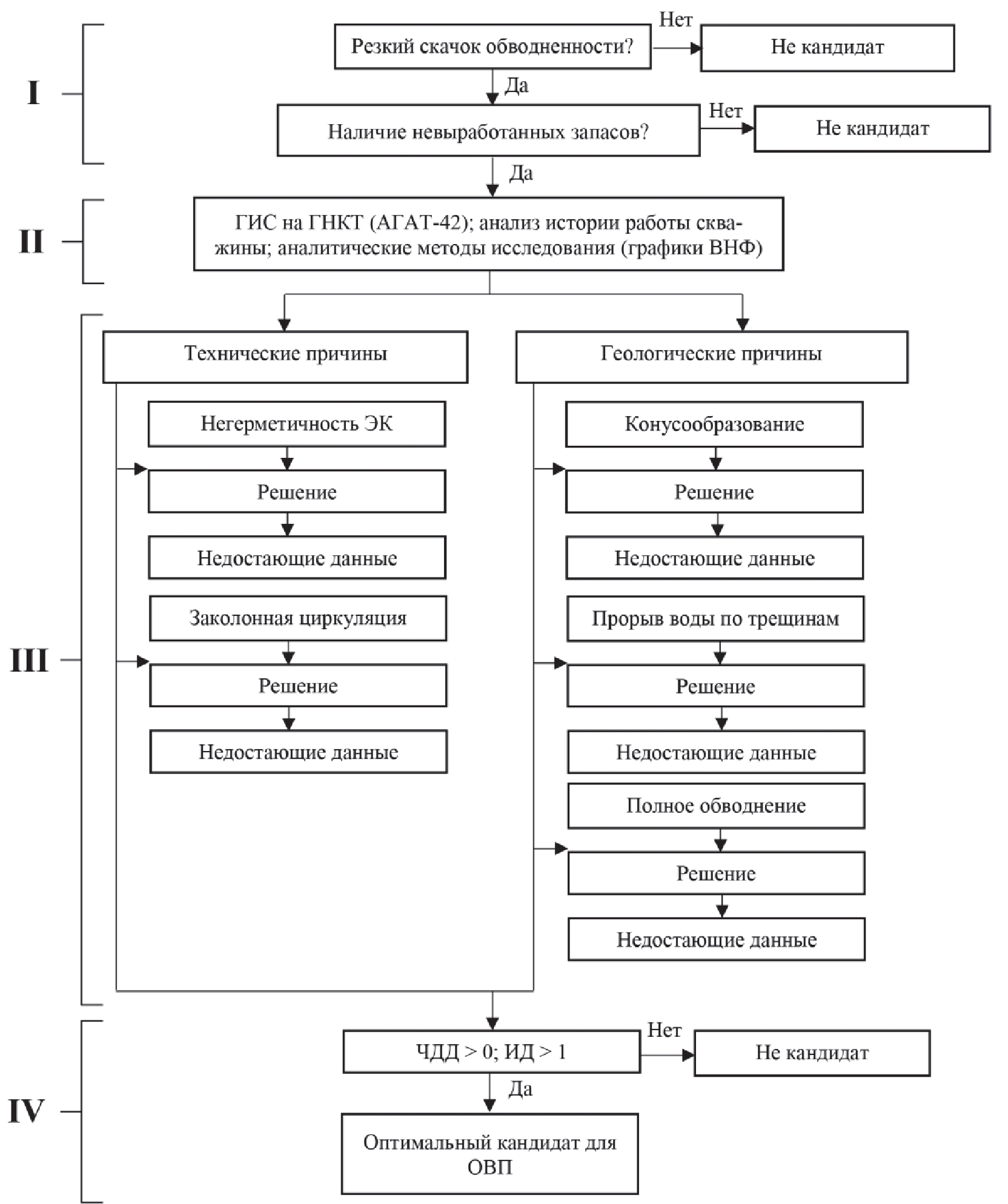 Приведённая на рис. 1 методика определения пригодности скважины для водоизоляционных работ включает в себя 4 ключевых этапа.