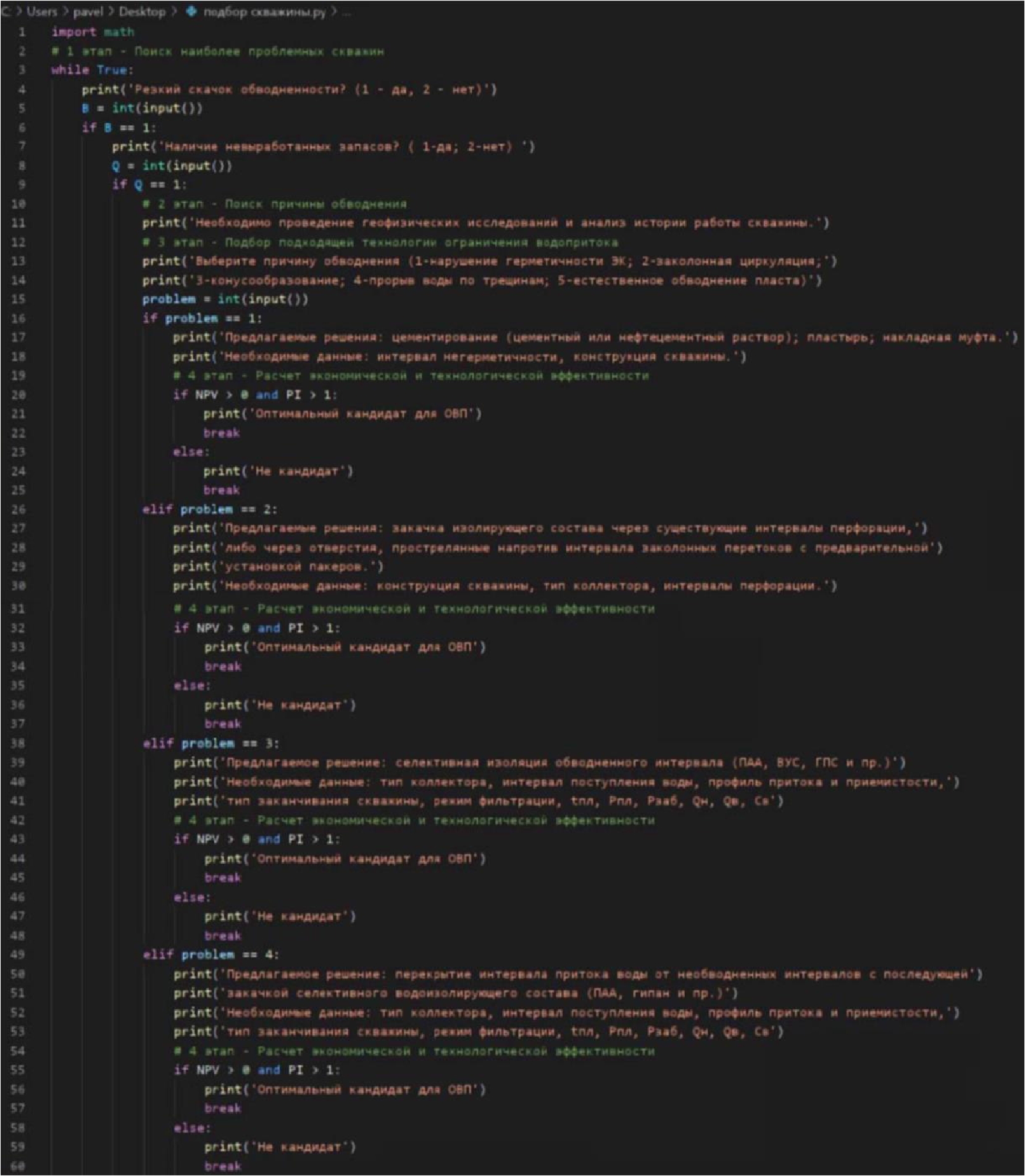 - Расчёт экономической и технологической эффективности. На данном этапе производится математическое моделирование результатов ремонтно-изоляционных работ и их последующая оценка. Рассчитываются такие параметры, как дополнительная добыча, чистый дисконтированный доход (ЧДД) и индекс доходности (ИД). При ЧДД>0 и ИД>1 проект признаётся рентабельным и в дальнейшем рассматривается в качестве потенциального к непосредственной реализации. Данный алгоритм запрограммирован в среде Python (рис. 4).