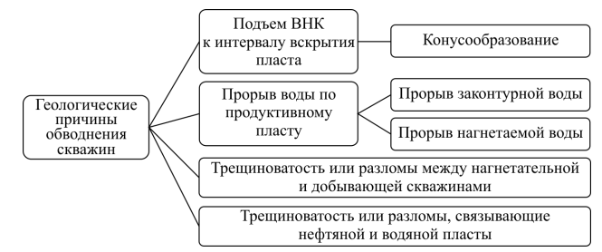 Существуют также и геологические причины обводнения. Основные из них: подъём ВНК к интервалу перфорации, прорыв воды по продуктивному пласту, трещиноватость, позволяющая прорываться воде из нагнетательной скважины, и трещиноватость, по которой вода из водоносных горизонтов переходит в нефтеносные. Классификация геологических причин обводнения приведена на рис. 3.