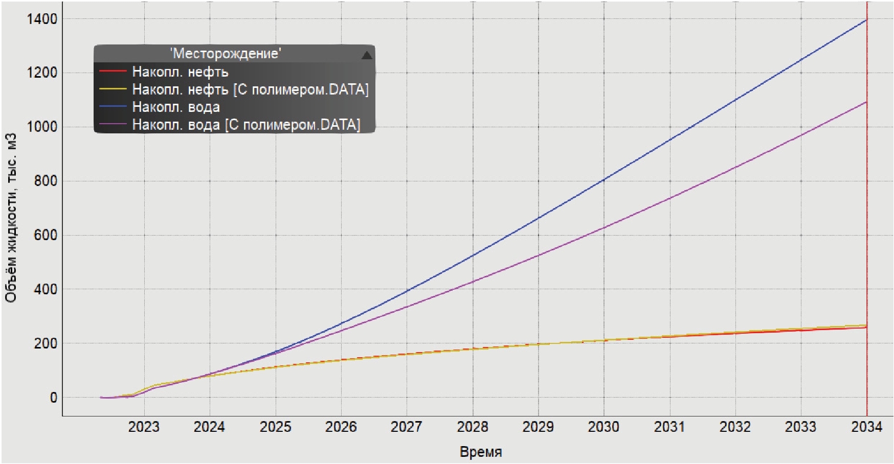 На приведённом графике накопленных отборов (рис. 7) можно видеть, что при использовании полимерного заводнения снижаются отборы воды и повышаются отборы нефти, связано это с вышеперечисленными факторами.