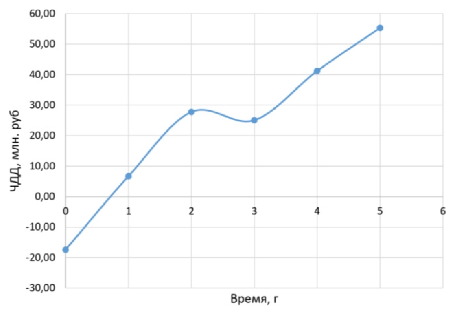 Внутренняя норма доходности определялась при помощи функции ВСД в пакете Microsoft Excel (функция ВСД в Excel возвращает внутреннюю ставку доходности для ряда потоков денежных средств). Её величина составила 101 %. Объясняется такое большое значение тем, что при малых капитальных затратах и значительном периоде расчёта в 5 лет количество дополнительно отобранной нефти перекрывает все вложенные средства уже после 8 месяцев работы [32–34]. Таким образом, срок окупаемости составил 8 месяцев, а чистый дисконтированный доход – 55,33 млн р. График изменения чистого дисконтированного дохода показан на рис. 8.