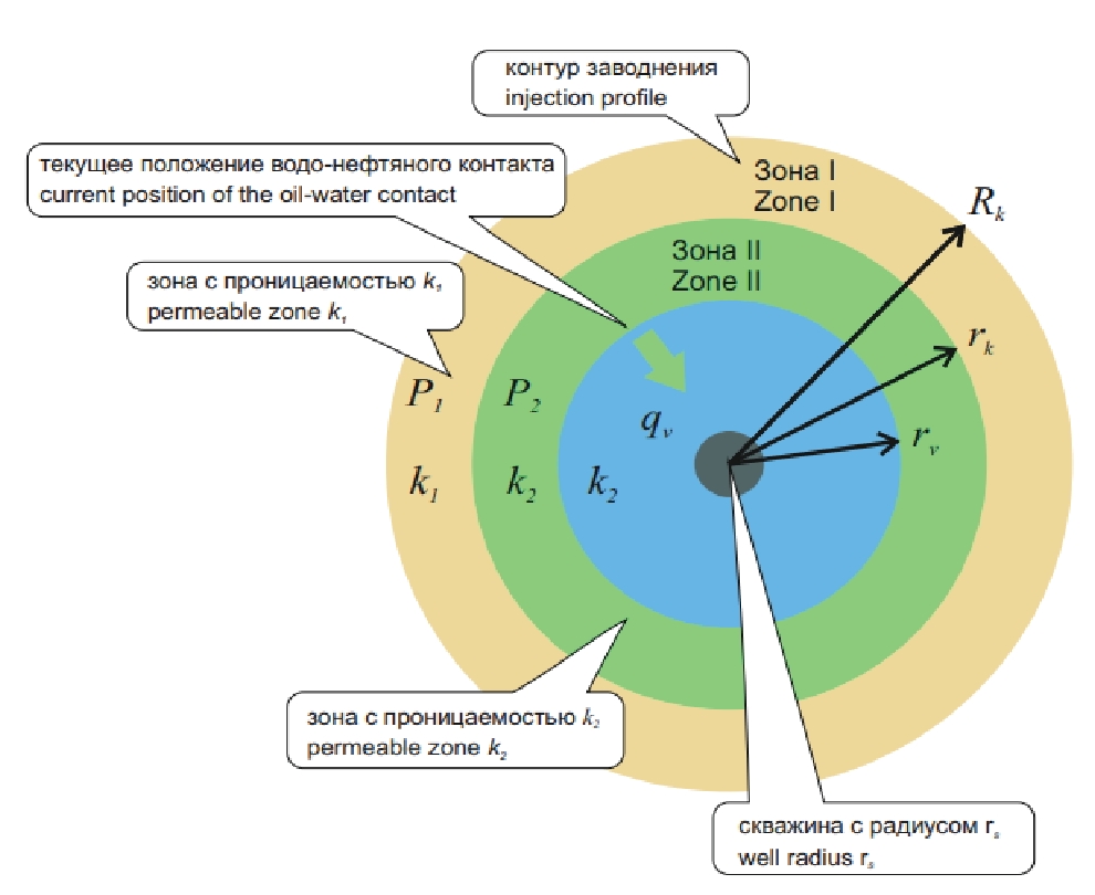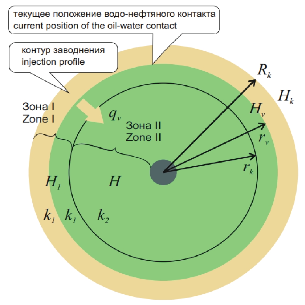 Фильтрация углеводородной системы к центральной скважине при вытеснении водой в зонально-неоднородном пласте схематически показана на рис. 2. По схеме видно, что текущее положение фронта воды имеет радиуса rv. Контур заводнения имеет радиус Rk, а rv – текущее положение ВНК [21].