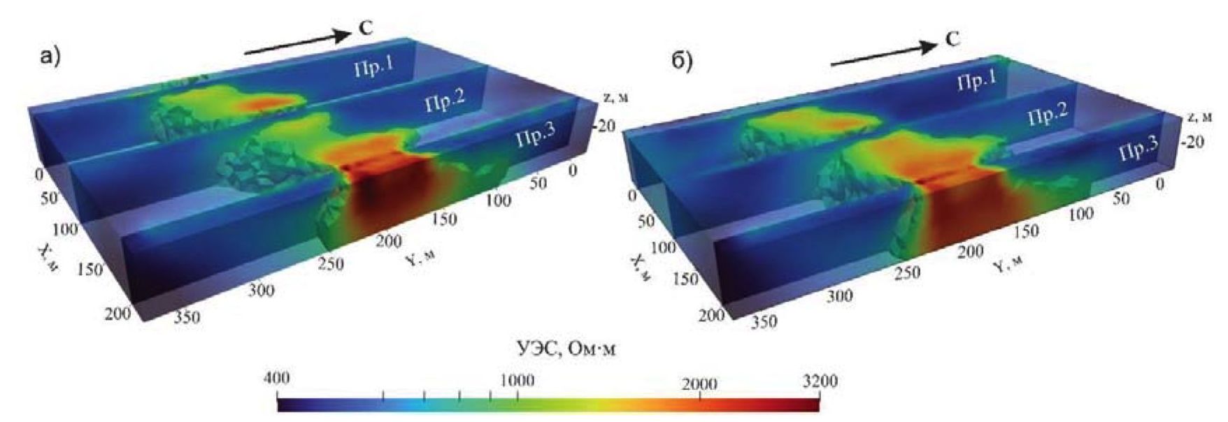 Общими параметрами двух моделей являются: УЭС вмещающей среды – 588 Ом·м, УЭС объекта (коренника) – 2000 Ом·м; размер области моделирования – 1400×1400×350 м; углы наклона боковых границ объекта в районе профиля 3–50°, а для северной границы – 25°, в областях 1 и 2 профилей углы субвертикальные.