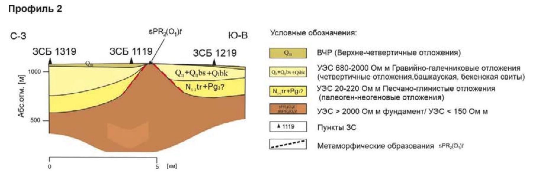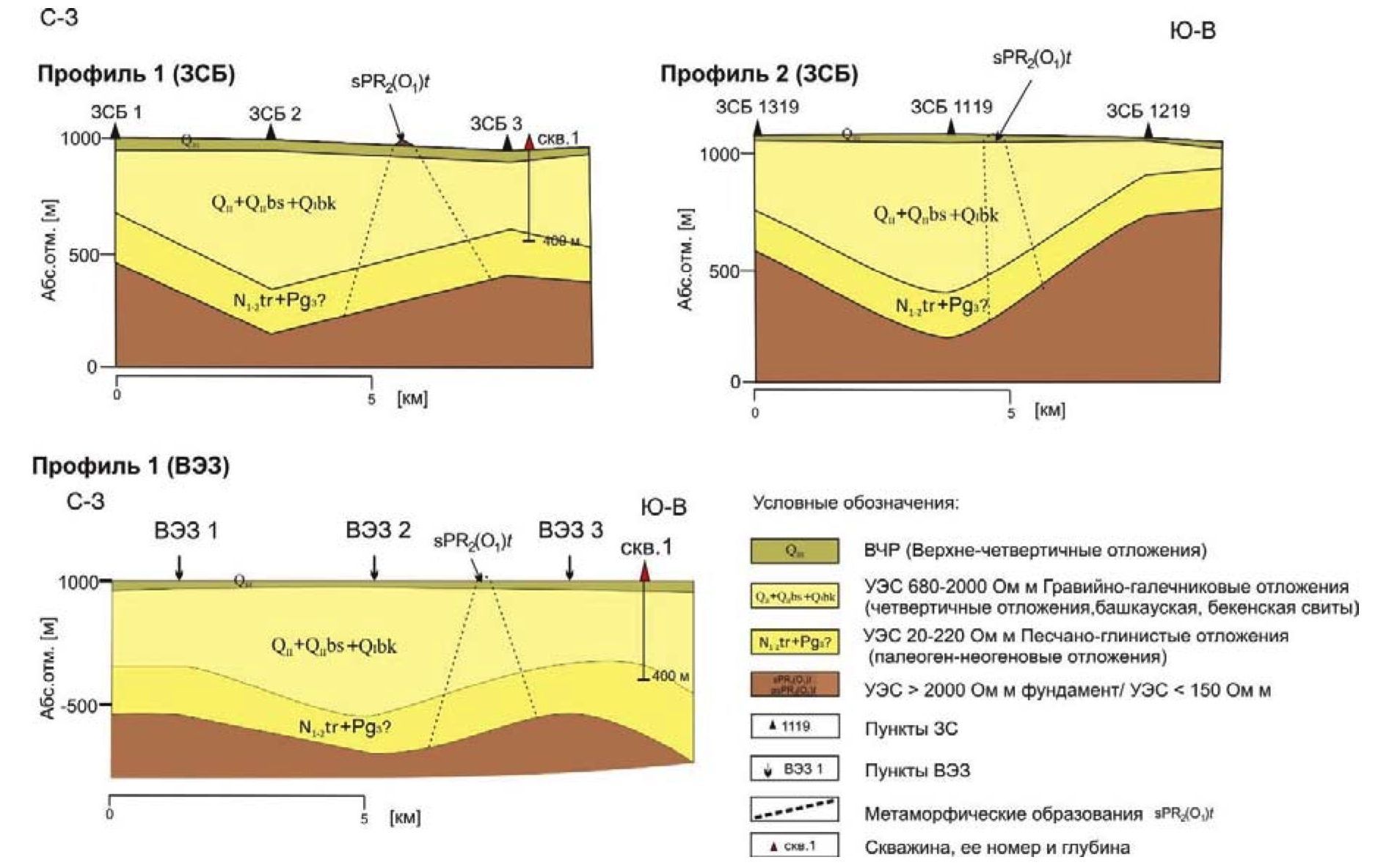 Рассмотрим полученные ранее геоэлектрические разрезы по двум профилям ЗСБ и одному профилю ВЭЗ (рис. 5). Эти разрезы подтверждают интенсивные тектонические движения в четвертичный период, которые привели к значительной складчатости фундамента и осадочного заполнения, амплитуды складок достигают 500 м и более. Довольно большой шаг между пунктами ВЭЗ и ЗСБ в 2–3 км не позволяет достоверно выявлять локальные структурные особенности. На всех разрезах пунктирной линией показано предполагаемое продолжение коренников, наблюдаемых на дневной поверхности, в глубину.