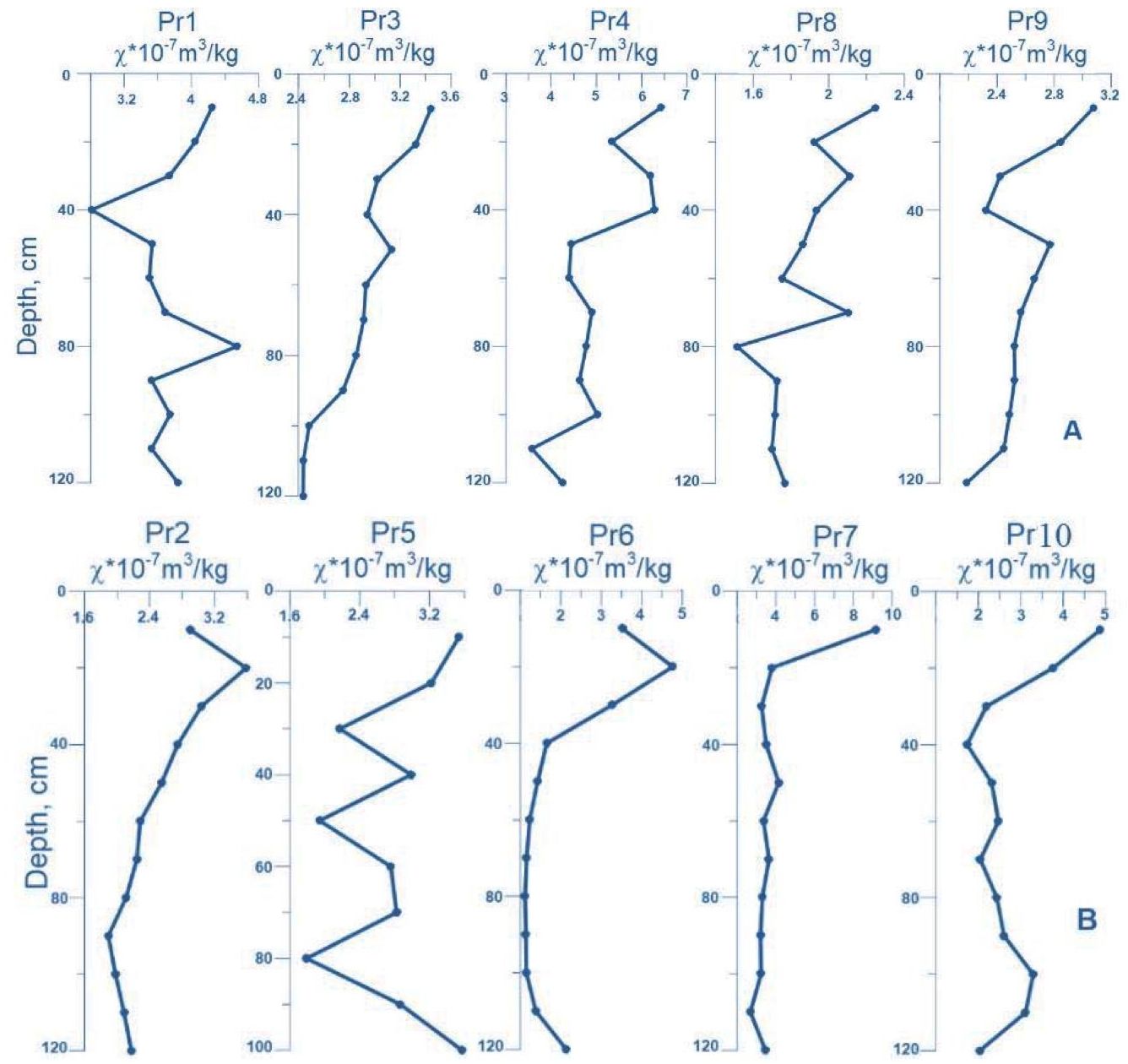 The transformation and migration of iron compounds during the soil-formation change soil magnetic susceptibility. It means that magnetic susceptibility reflects soil-formation and can be considered as a diagnostic indicator [23]. As for the results of magnetic susceptibility within the research area, some magnetic profiles behave like humus profiles. There is both an accumulative type of profile magnetic components distribution, which demonstrates a gradual decline in the magnitude of magnetic susceptibility (profiles 2, 6, 7, 10), and a mixed type (profiles 1, 3, 4, 8, 9), which is characterized by the magnetic component transformation into the upper and middle layers of the soil, where their accumulation occurs.