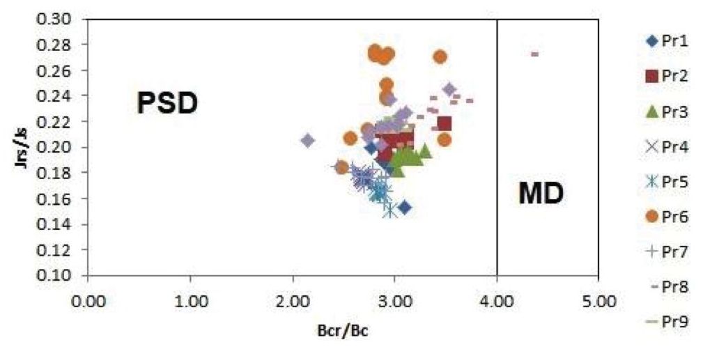 The Bcr/Bc and Jrs/Js ratios depict the prevailing grain size and the ratios between magnetic fraction and different domain structures. According to the Day–Dunlop diagram [20], magnetic minerals of the studied soil samples fall into the category of pseudo-single-domain particles. Getting into the area of pseudo-single-domain particles suggests that the magnetic components of the studied soils are present in the clay fraction.
