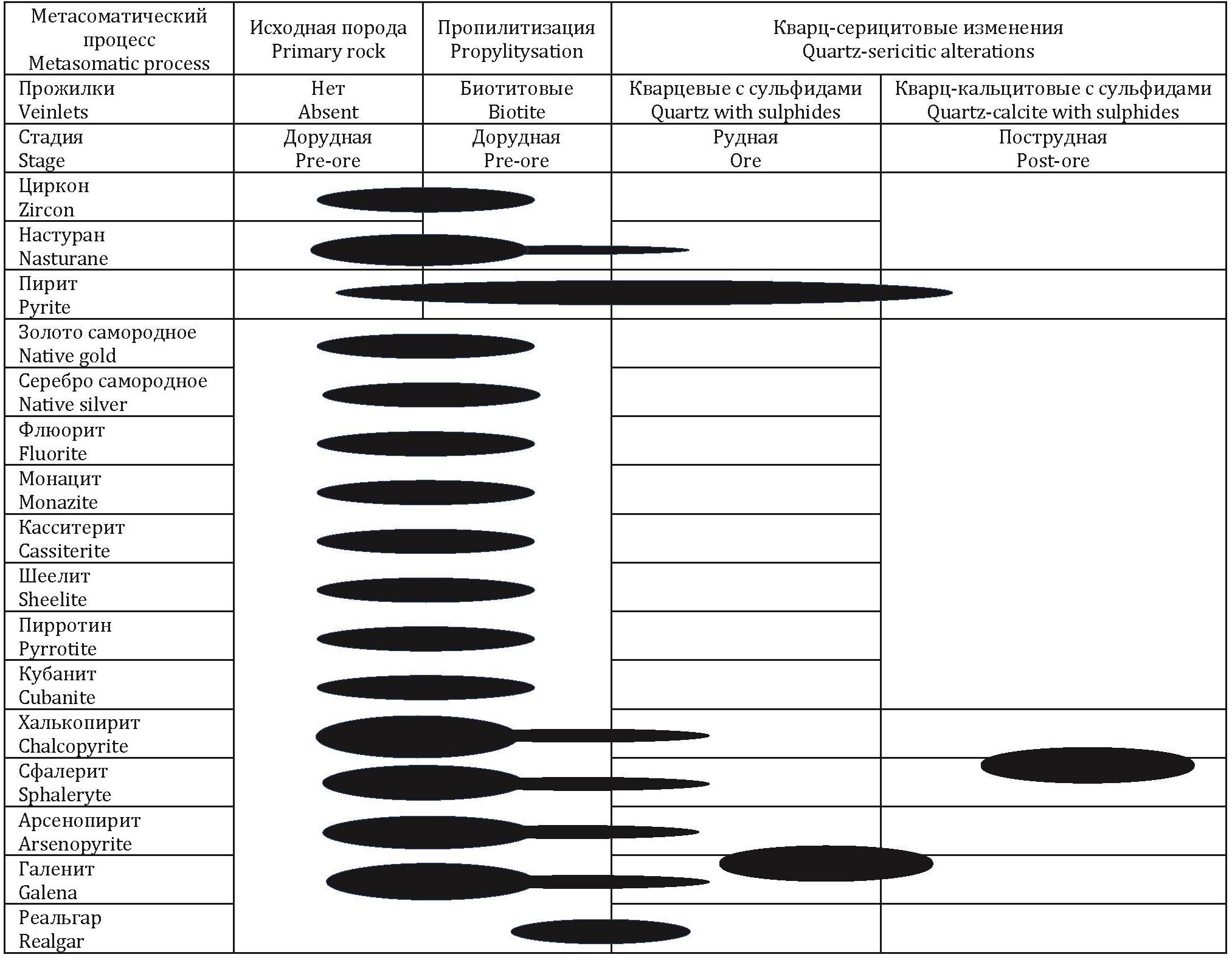 Приуроченность образования рудных и жильных минералов к стадиям метасоматических изменений была получена по результатам исследования идиоморфности отдельных кристаллов рудных фаз и их взаимоотношений с агрегатами вмещающих фаз и базируется на результатах предыдущих исследований, изложенных в [3]. Последовательность метасоматических процессов и приуроченность к ним сульфидной минерализации по результатам проведённого исследования методами оптической и электронной сканирующей микроскопии следующая: пропилитизация (стадия 1): пирит метасоматический, касситерит, шеелит; серицитизация и окварцевание (стадия 2): пирит метасоматический, пирит прожилковый, халькопирит, галенит, сфалерит, арсенопирит, реальгар, пирротин, пентландит, кубанит, киноварь, серебро и золото самородные, настуран, флюорит, монацит; карбонатизация (стадия 3): пирит метасоматический; циркон, по всей видимости, образован в дометасоматический этап.