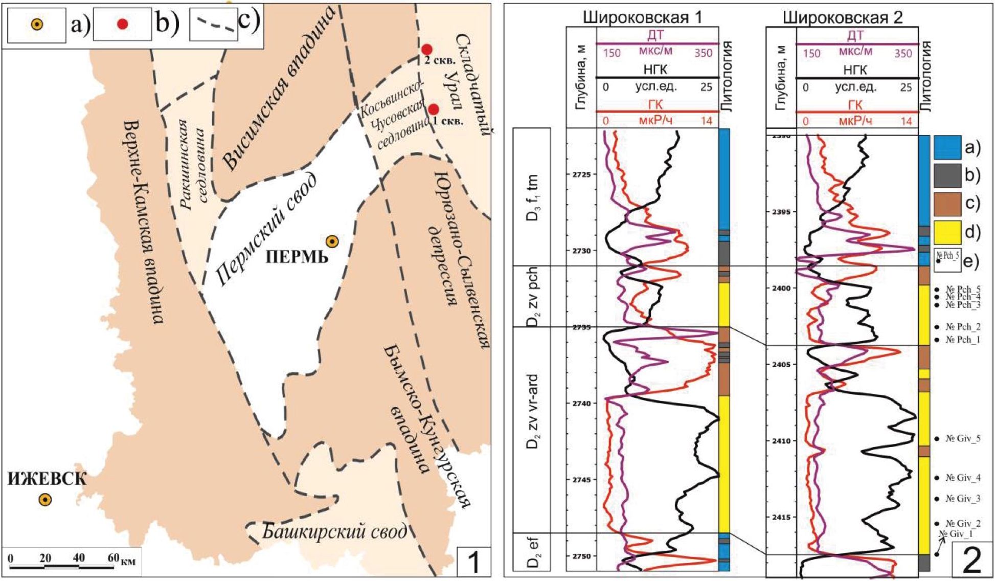 Fig. 1. Location of the studied well on the tectonic scheme of the Perm Krai (1) and correlation diagram of the studied section of the Shirokovskaya 2 well and the reference section of the Shirokovskaya 1 well (2). Symbols for figure (1): a) cities; b) wells; c) boundaries of tectonic structures. Symbols for figure (2): a) carbonate rocks; b) argillites; c) siltstones; d) sandstones; e) sampling points and their number