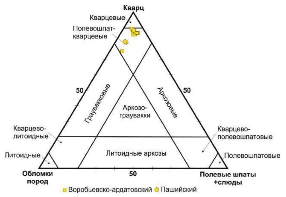 Песчаники воробьевско-ардатовского интервала являются петрогенными, образованными за счет разрушения первично-магматических и метаморфических пород преимущественно кислого и основного состава. Песчаники пашийского горизонта лито- и петрогенные. В области источника разрушались магматические и метаморфические породы кислого и основного составов.