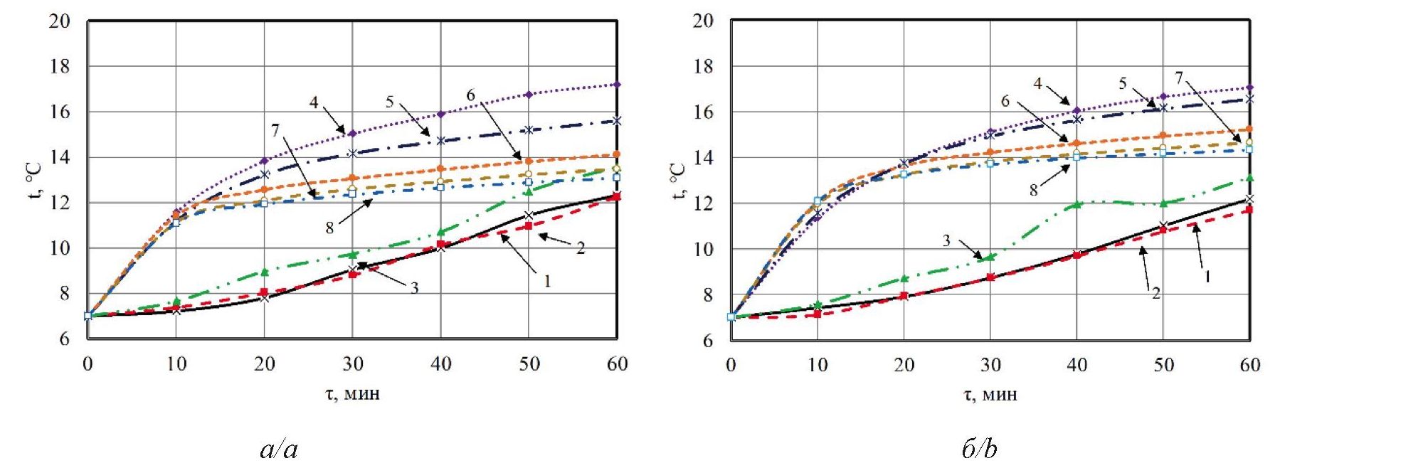 Fig. 18. Average air temperature in local working air change (0<Y<2 m) at a distance of 0.4 m from the panel on the left (a) and right (b) in time at different air flow rates, kg/(s∙m³): 1) 0, 1) 0; 2) 1×10⁻⁴, 3) 6×10⁻⁴, 4) 11×10⁻⁴, 5) 17×10⁻⁴, 6) 22×10⁻⁴, 7) 27×10⁻⁴, 8) 33×10⁻⁴