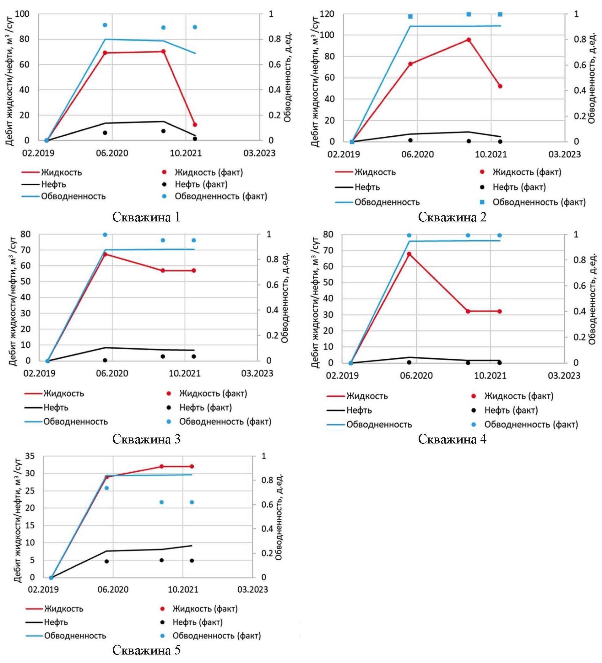 На следующем этапе проведен ретроспективный прогноз по новым скважинам. За последний год по результатам эксплуатационного бурения на объекте пробурено пять новых скважин. В рамках эксперимента проведены расчеты модели с учетом данных скважин и без дополнительных настроек, чтобы проверить способность гидродинамической модели с полученными ОФП и оценить эффективность бурения новых скважин. По результатам расчетов отклонения по добыче нефти по новым скважинам не превышают 8 % (рис. 7). Даже при условии, что все скважины по фактическим данным вступают с обводненностью более 80 %, модель показывает высокую предиктивную способность и позволяет учитывать конусы обводнения.