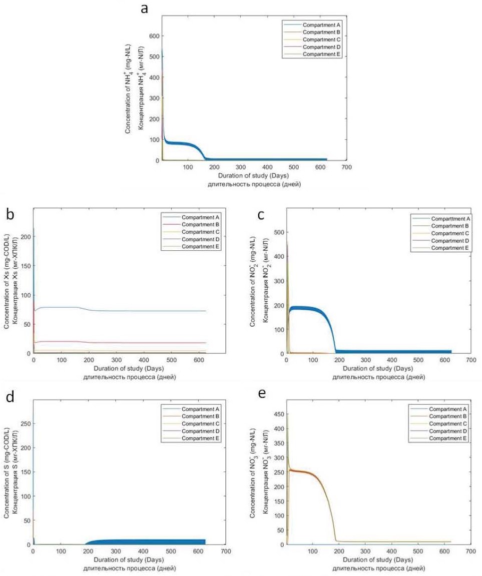 Рис 3. Концентрации NH₄⁺(a), медленно биоразлагаемого субстрата (Xs) (b), NO₂⁻(c), биоразлагаемых органических веществ (S) (d), NO₃⁻(e) в сточных водах в РИВВП