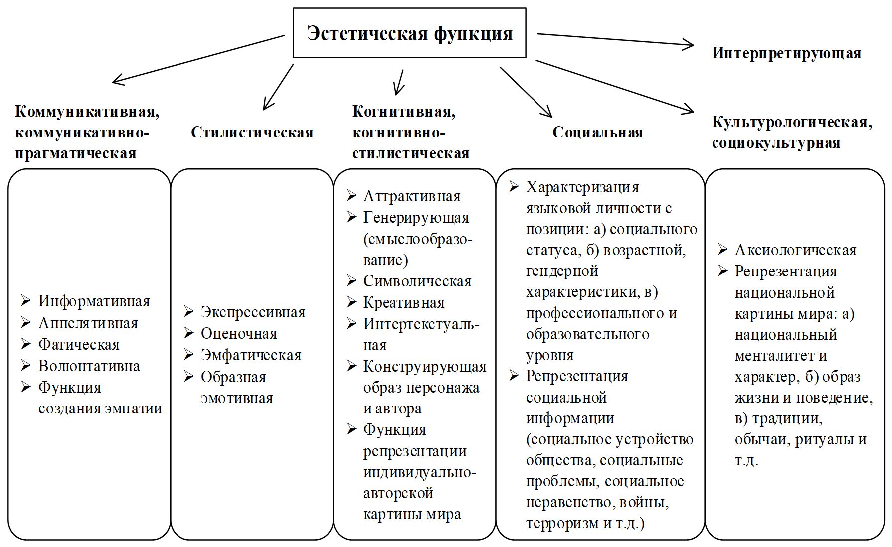 - Базовыми функциями художественного текста являются семь функций: эстетическая, коммуникативная, стилистическая, когнитивная, социальная, культурологическая и интерпретирующая, первая выполняет доминирующую роль, объединяя и подчиняя все остальные.