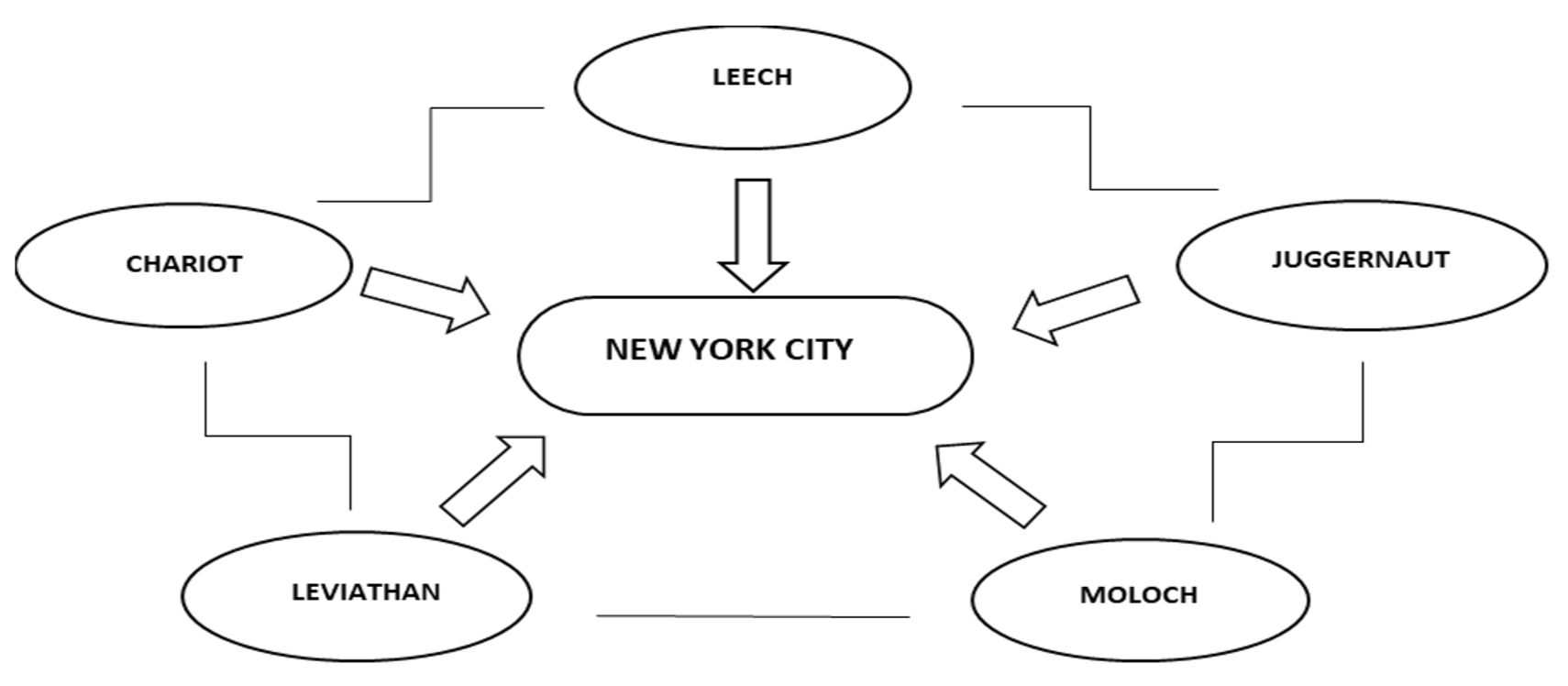 We can observe the convergence of stylistic devices in this text fragment, specifically, metaphors, epithets and allusions are used in order to portray the city. Among those stylistic devices vivifying the magnitude and cruelty of the city, RMAs “leech”, “juggernaut”, “Moloch”, “leviathan” and “chariot” set a special tone in the description of the dominant literary concept – NYC: