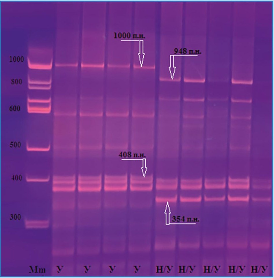На рисунке 1 видно, что маркер PBCESSRJU13 выявляет полиморфизм между контрастными по устойчивости к альтернариозу формами капусты белокочанной. С помощью маркера молекулярной массы определен размер ПЦР-продуктов: устойчивые аллели – 408 и 1000 п.н., неустойчивые – 354 и 948 п.н.