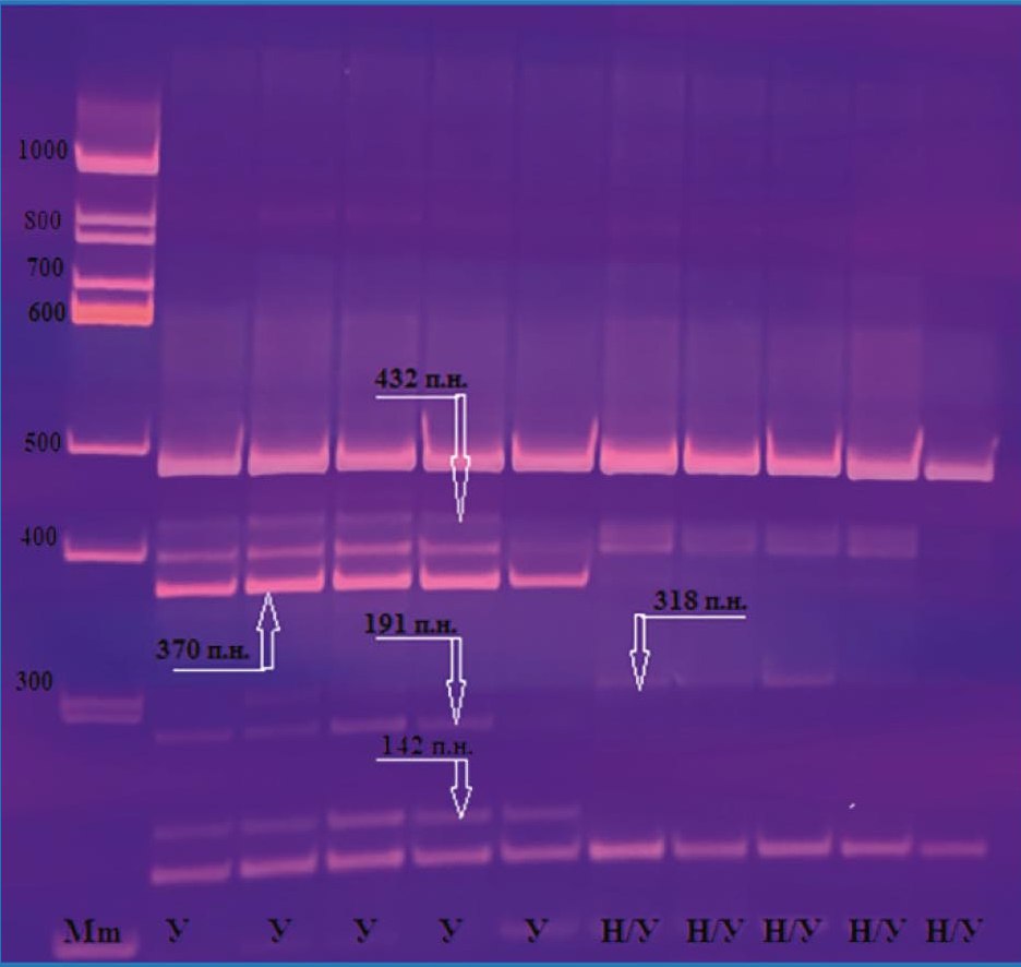 На электрофореграммах видна аллельная разница между изучаемыми контрастными формами капусты белокочанной (рис. 2, 3, 4-я стр. обл.). Размер аллелей устойчивости по локусу PBCESSRJU6 – 142, 191, 370 и 432 п.н., аллеля восприимчивости – 318 п.н, по локусу NI-F02a размер обнаруженных ПЦР-продуктов составляет 400, 650 и 975 п.н. (устойчивые), 700 п.н. (неустойчивые).