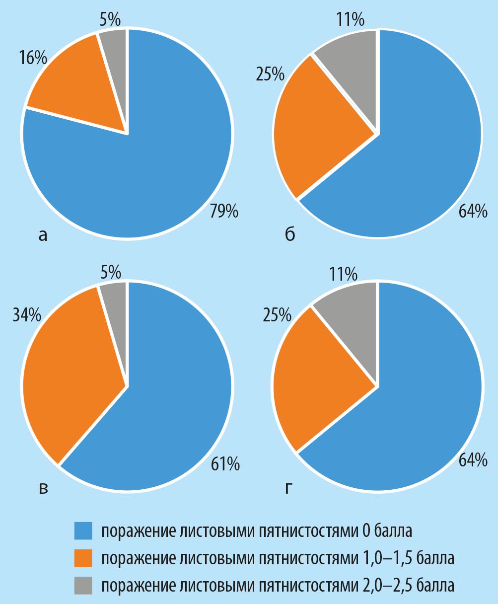 По многолетним данным вид Grossularia robusta абсолютно не поражался листовыми пятнистостями (рис. 1а, 2-я стр. обл.). Анализ устойчивости к антракнозу и септориозу у гибридов, полученных с участием Grossularia robusta, показал, что во всех гибридных семьях превалируют сеянцы либо с отсутствием признаков поражения, либо с незначительной степенью таковых от 0 до 1,0…1,5 балла (рис. 1б, 2-я стр. обл.). Единичные сеянцы с максимальным баллом поражения (до 2,0…2,5) наблюдали в семьях 258 (13-15-1 × Grossularia robusta) (рис. 2а, 2-я стр. обл.) и 288 (151-НС-7 × Grossularia robusta) (рис. 2б, 2-я стр. обл.), 250 (23-17-10 × Grossularia robusta) (рис. 2в, 2-я стр. обл.) и 283 (142-х36-12 × Grossularia robusta) (рис. 2г, 2-я стр. обл.).