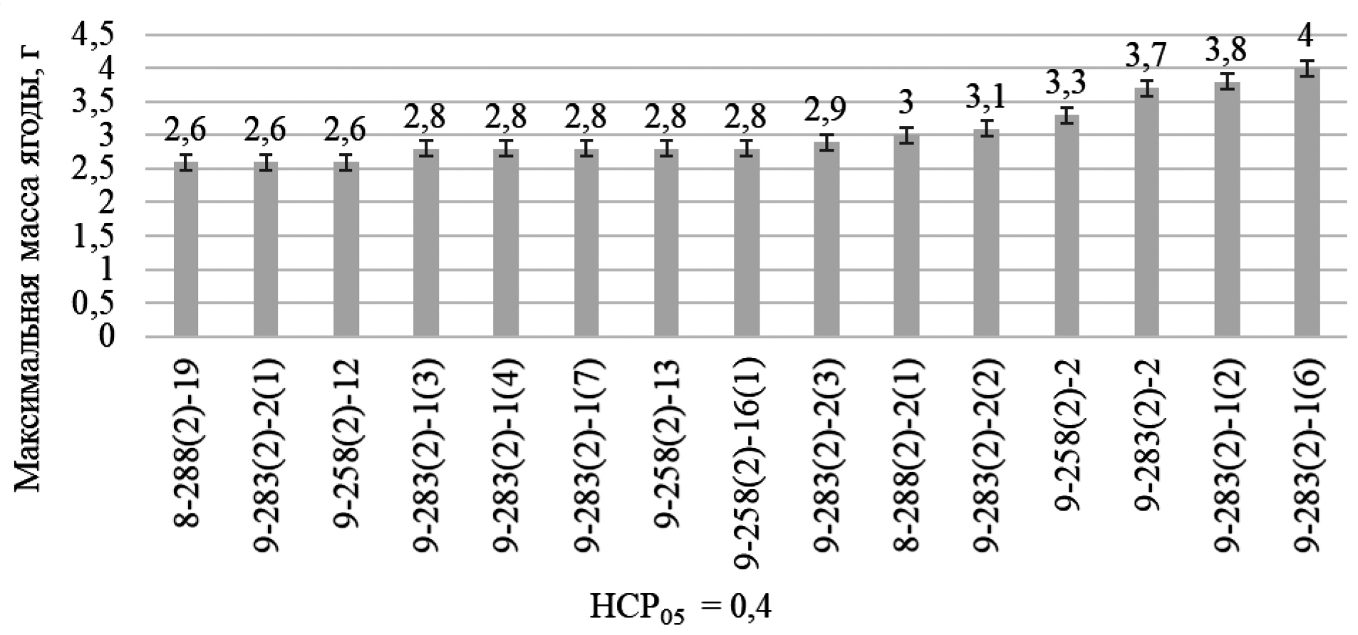 Одно из условий, предъявляемое к сортам крыжовника, пригодных для машинной уборки, – минимальное ограничение по массе ягоды (более 1,2 г). Большая часть отборных форм удовлетворяла этому требованию, а некоторые даже превышали: 8-288(2)-2(1) – 2,0 г, 9-283(2)-1(2), 9-283(2)-1(6) – 2,1 г, 9-283(2)-2 – 2,2 г (рис. 4). Так же в гибридных семьях, полученных от отдаленных скрещиваний с Grossularia robusta, обнаружен значительный потенциал по максимальному выражению признака массы ягоды. У превалирующего числа гибридных сеянцев максимальная масса ягоды колебалась от 2,8 до 3,0 г, минимальное – до 2,6 г у 8-288(2)-19, 9-283(2)-2(1), 9-258(2)-12, максимальное – свыше 3,0 г у 9-258(2)-2, 9-283(2)-2, 9-283(2)-1(2) и 9-283(2)-1(6) (рис. 5).