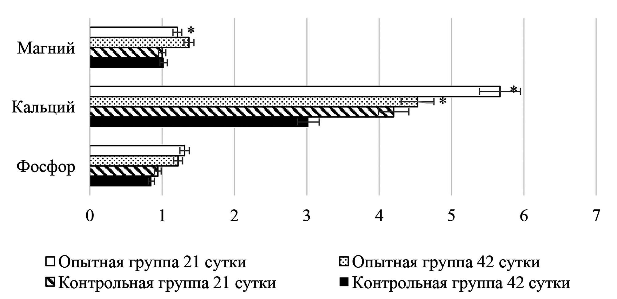 На 21 сут. увеличилось содержание магния у птиц, получавших ОР+Ф+QC на 21,0%, кальция – 35,2, кальция (42 сут.) – 18,6, уменьшилось железа – на 7,46%, по сравнению с группой ОР. В связи с тем, что фитобиотик проявляет диуретические свойства, в крови повысилась концетрация магния, кальция и фосфора. Снижение содержания железа можно объяснить способностью дубильных кислот связывать его в хелаты и нормализовывать сывороточный ферритин.