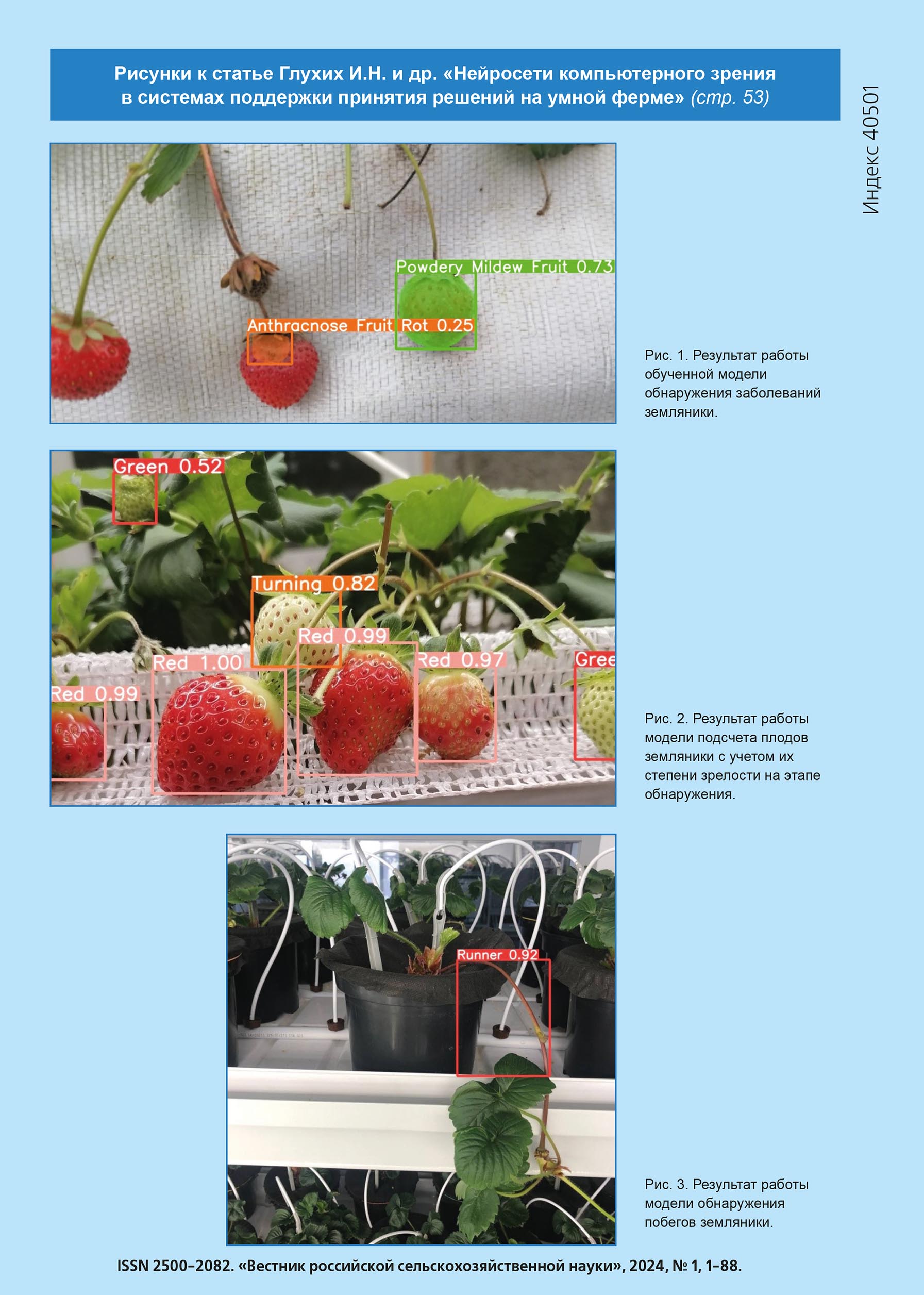 В проведенных экспериментах использовали изображения кустов и плодов земляники. Предложенные модели могут служить для организации наблюдения при выращивании и другой продукции умной фермы (томаты, огурцы). Принципиальным становится формирование процессов обучения нейросетевых моделей на соответствующих данных (примеры изображений). При этом эксперименты показали, что даже для современных предобученных нейросетей для повышения точности необходимо дообучение на примерах изображений со своей фермы в условиях, отвечающих ожидаемым при эксплуатации.