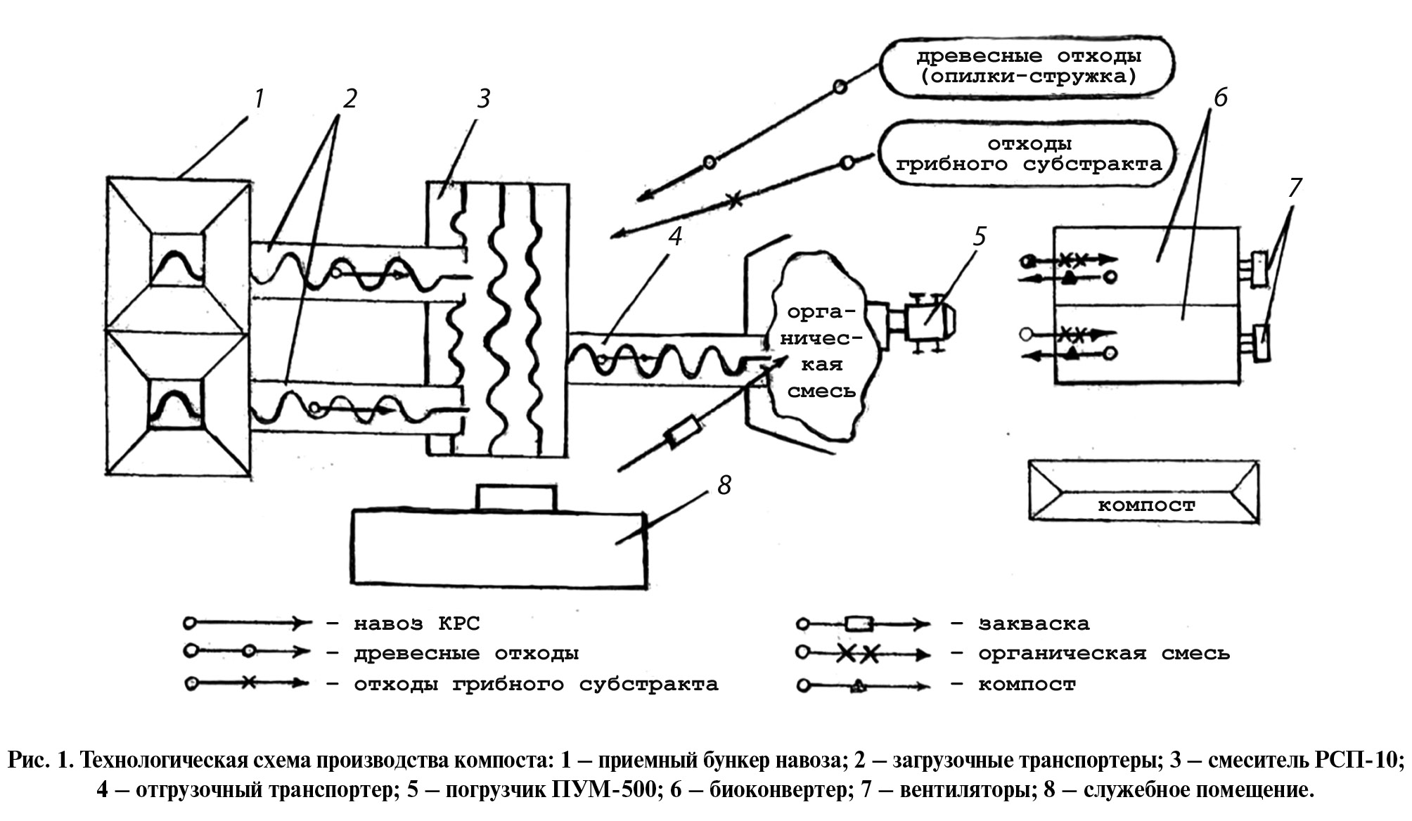 Рис. 1. Технологическая схема производства компоста: 1 – приемный бункер навоза; 2 – загрузочные транспортеры; 3 – смеситель РСП-10; 4 – отгрузочный транспортер; 5 – погрузчик ПУМ-500; 6 – биоконвертер; 7 – вентиляторы; 8 – служебное помещение.