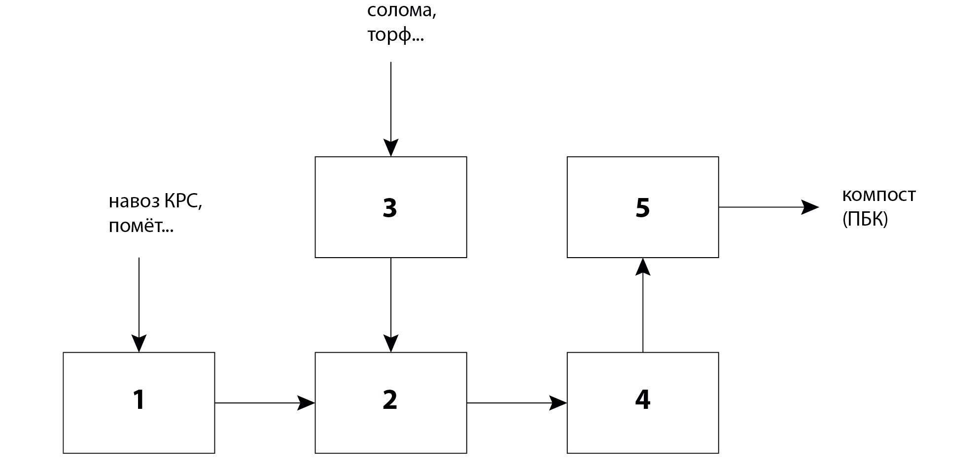 Рис. 2. Технологическая схема перспективной технологии аэробной ферментации: 1 – приемный бункер, 2 – шнек-смеситель, 3 – транспортер равномерной выдачи (Патент № 246151), 4 – шнек загрузки биоконвертера; 5 – биоконвертер (Патент № 2461511).