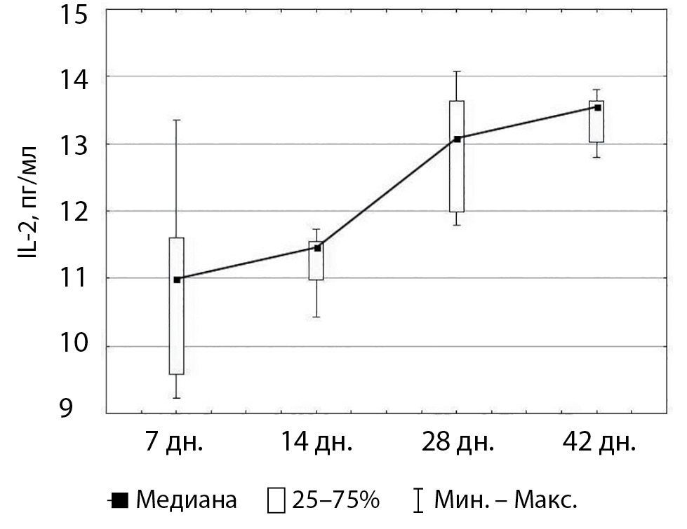 Установлено, что до 14-суточного возраста у цыплят-бройлеров динамика нарастания уровня IL-4 в сыворотке крови была относительно стабильной. Но при рассмотрении содержания IL-4 выявили нестабильные изменения – повышение сывороточного количества IL-4 на 14 сутки физиологического развития бройлеров чередовалось снижением данного показателя к 28 дню развития, которое, в свою очередь, сменялось стойким его повышением к 42 суткам (рис. 4).