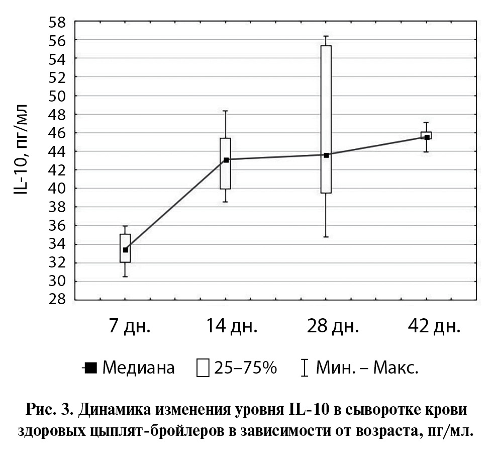 Рис. 3. Динамика изменения уровня IL-10 в сыворотке крови здоровых цыплят-бройлеров в зависимости от возраста, пг/мл.