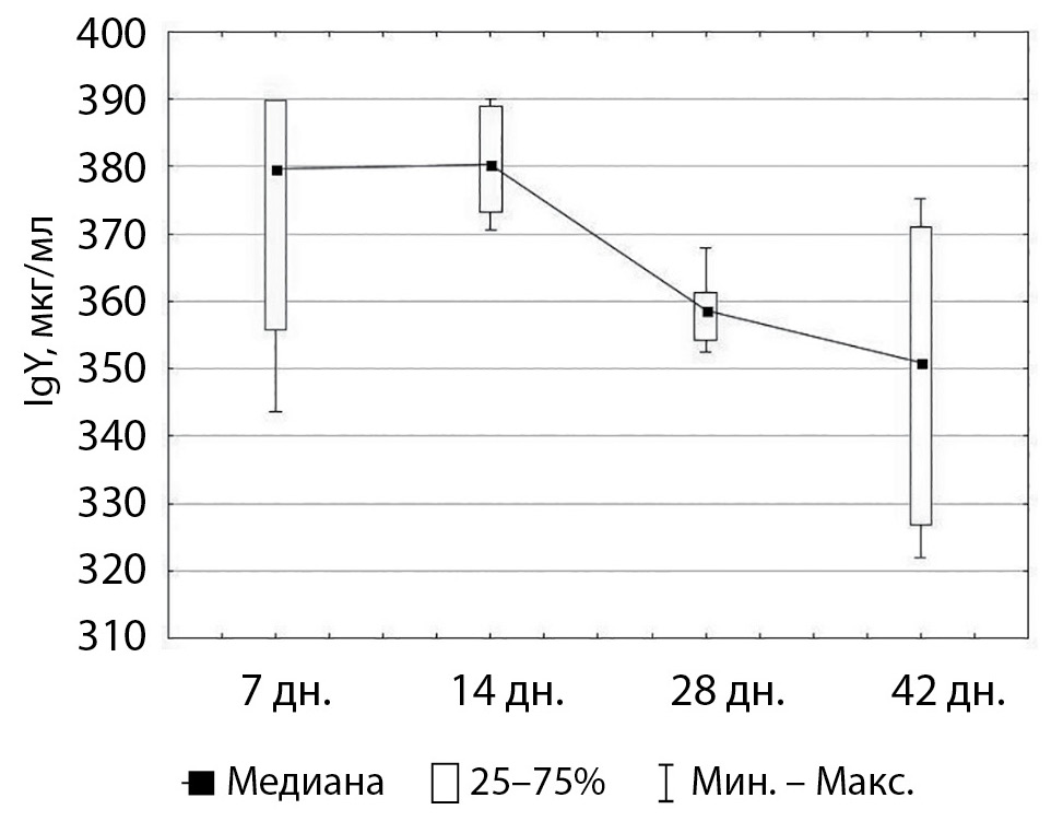 Несмотря на высокий уровень IgY в семидневном возрасте, у цыплят-бройлеров происходило истощение защитных сил в первые две недели жизни из-за распада овариальных глобулинов и морфофункциональной незрелости иммунной системы, в результате чего постепенно снижалось содержание данного иммуноглобулина, который к 42 суткам физиологического развития достиг минимальных значений.