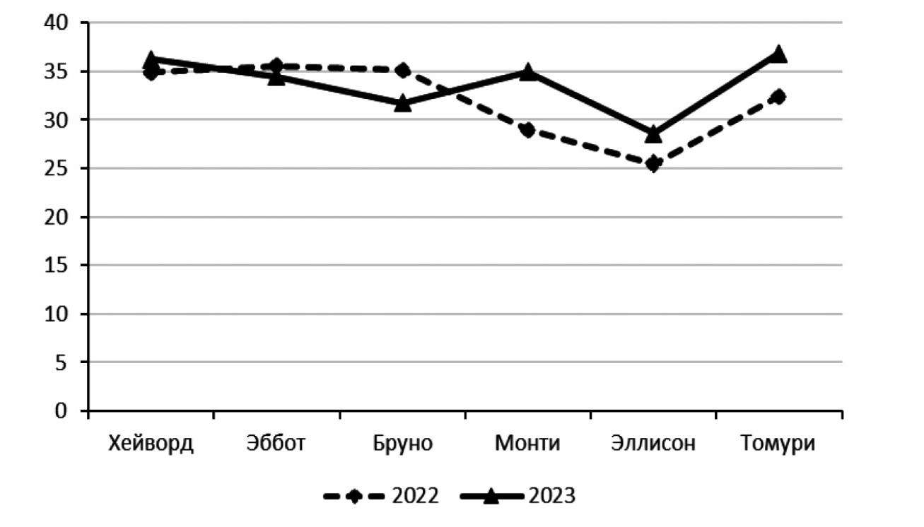 Анализ водного режима листьев актинидии показал, что водный дефицит в 2022–2023 годах в среднем составил 29,62…36,46%, минимальный отмечен у сортов Эллисон и Монти (29,62…30,21%), максимальный – Эббот (36,46%) (рис. 2). Оводненность листовых пластинок находилась на уровне 46,09…62,66%, количество сухого вещества – 25,47…35,53%.